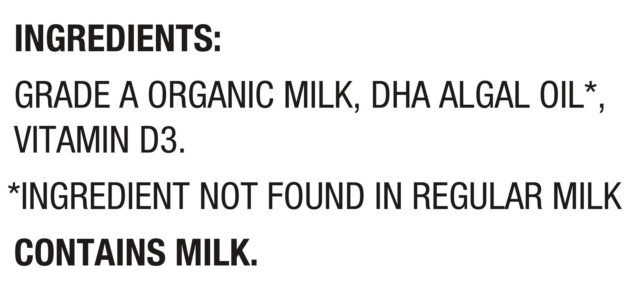 Ingredients: Grade a organic milk, dha algal oil*, vitamin d3 Contains: Milk