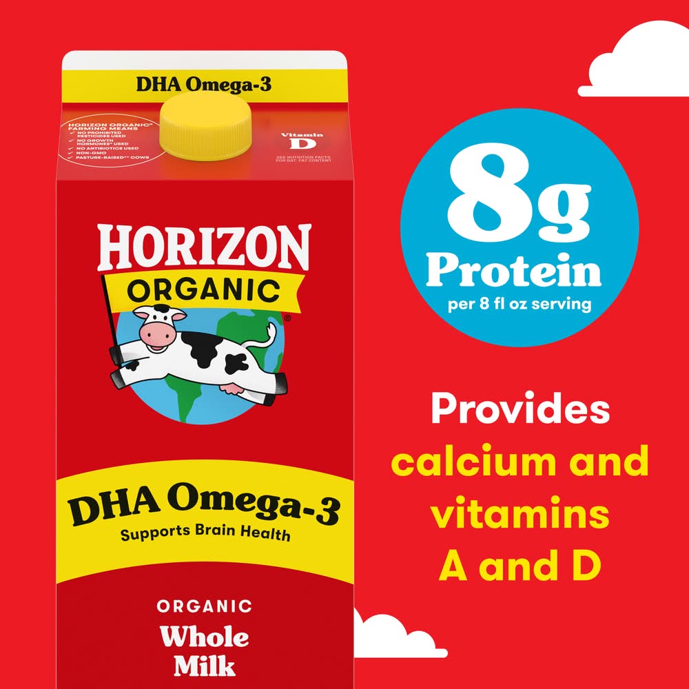 Get the joy of a cold glass of real milk with Horizon Organic DHA Omega-3 Whole Milk. With 32mg of DHA omega-3 from a vegetarian source in every delicious serving, this organic whole milk makes it super easy to get DHA into your day to help support brain and eye health. Always USDA Certified Organic, every Horizon milk carton comes from cows cared for by trusted farmers. Plus, it comes from cows that are fed non-GMO feed and not treated with antibiotics or growth hormones. Every 1 cup serving of this ultra-pasteurized whole milk has 8 grams of protein and provides nutrients, including calcium, vitamin A and vitamin D. It’s real organic milk that adults and kids can happily enjoy. At Horizon Organic, we believe that organic farming can drive healthier, more sustainable food communities for our world. Pioneering organic for the one horizon we all share. From our farmers to your family, Horizon Organic Milk is nourishing a happy, healthy future. • Horizon Organic Dairy, LLC, Broomfield,Co,80021 • Packaging: Reusable