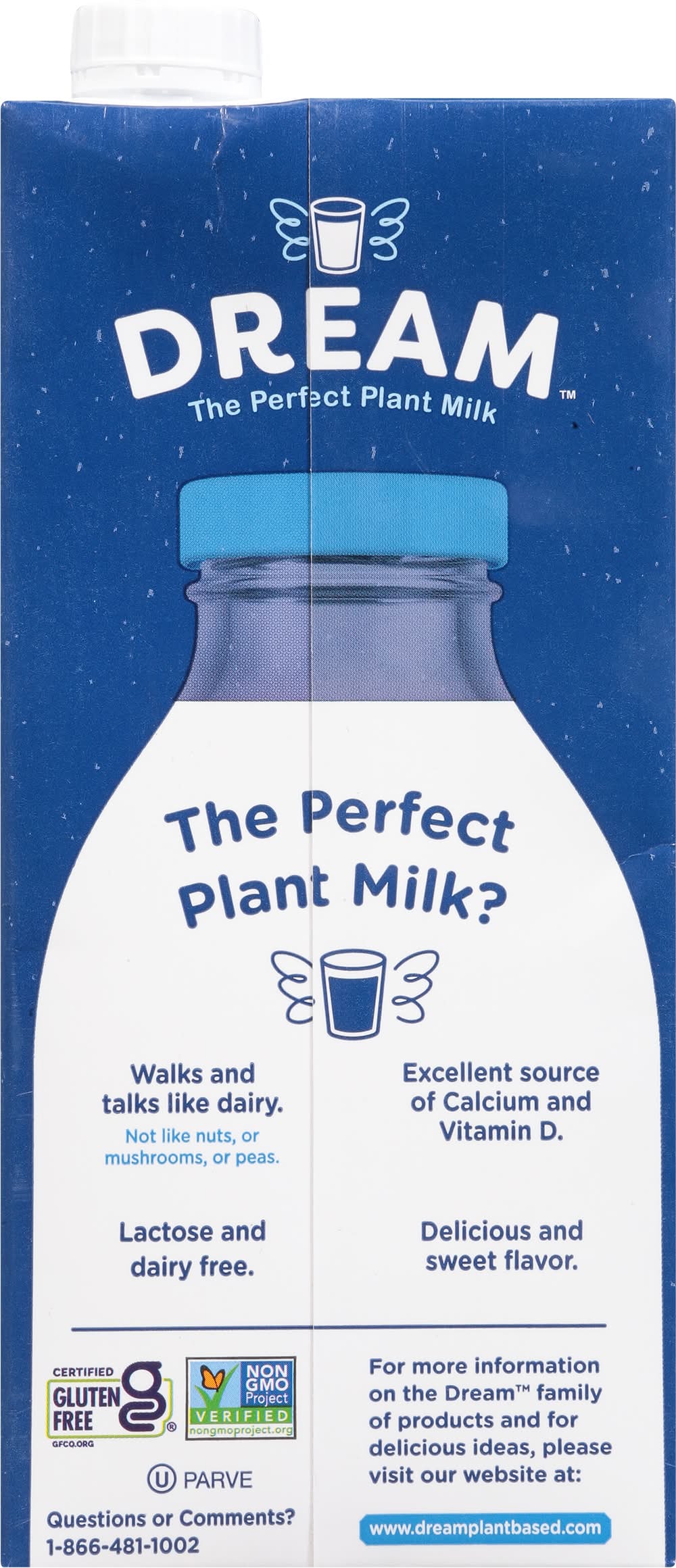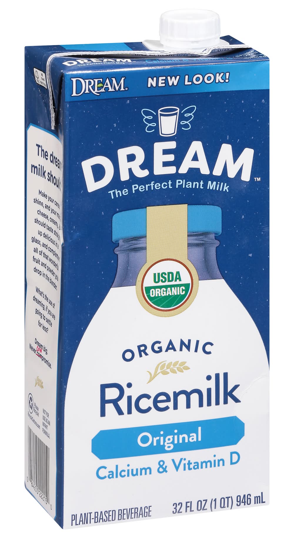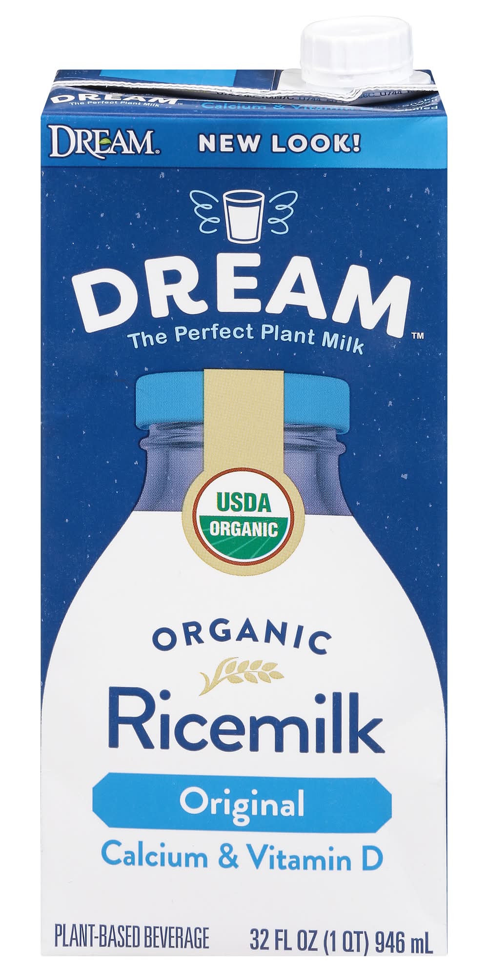 USDA Organic. Certified Organic: Quality Assurance International. Lactose free and dairy free. Soy free. Gluten free. Vegan. Calcium & vitamin D. Excellent source of calcium and vitamin D. With vitamins A and B12. Cholesterol free. Non-GMO Project verified. nongmoproject.org. Taste the dream. Non-dairy drinkers, reach confidently for delicious, Organic Rice Dream Enriched rice drink. It's refreshing and full of nutrition while being dairy free, soy free and low in fat. It pours on the flavor without cholesterol, but with plenty of Calcium and Vitamin D. So, Have a Dream about cereal, smoothies or other recipes, or just a cold, satisfying glass! About this box. This self-stable packaging protects flavor and maintains quality without preservatives or refrigeration! And it stores conveniently in your pantry, unopened, up to one year!. Try our other delicious non-dairy products: Soy dream. Sprouted rice dream. Almond dream. Coconut dream. Frozen desserts. Tetra Pak: Protects what's good. Tetra Pak: Tetra Brik Aseptic. • The Hain Celestial Group, Inc., Lake Success,NY,11042,USA • Packaging: Reusable