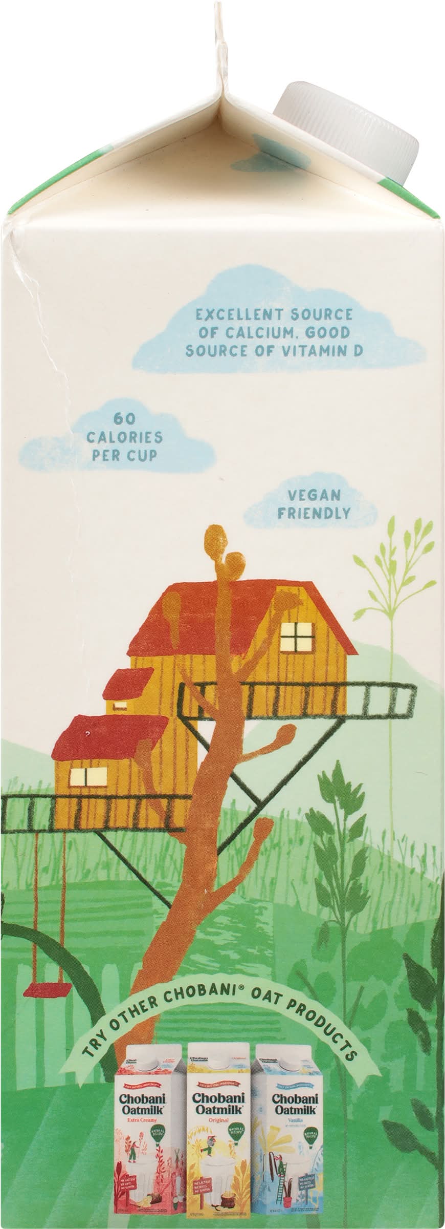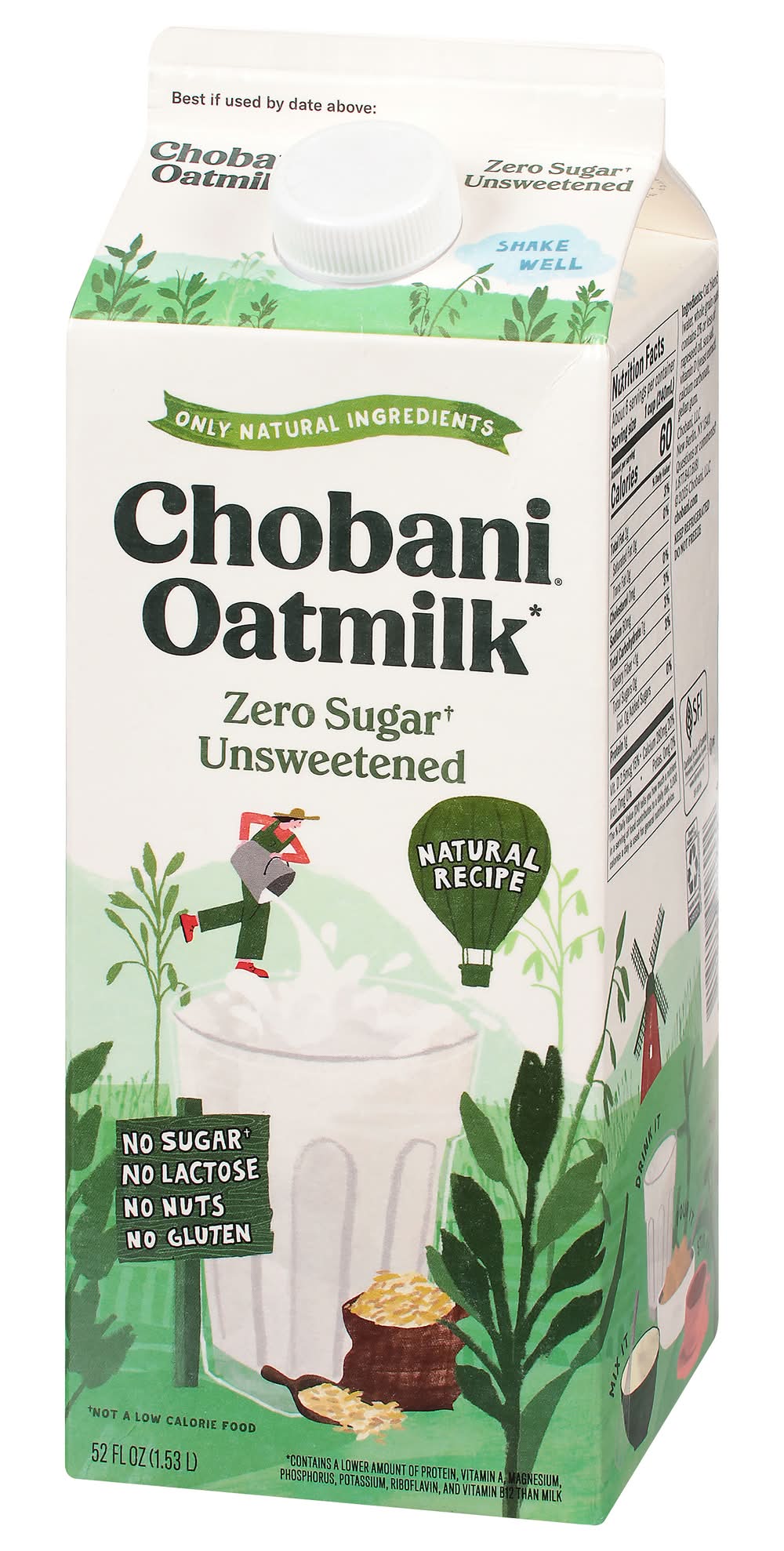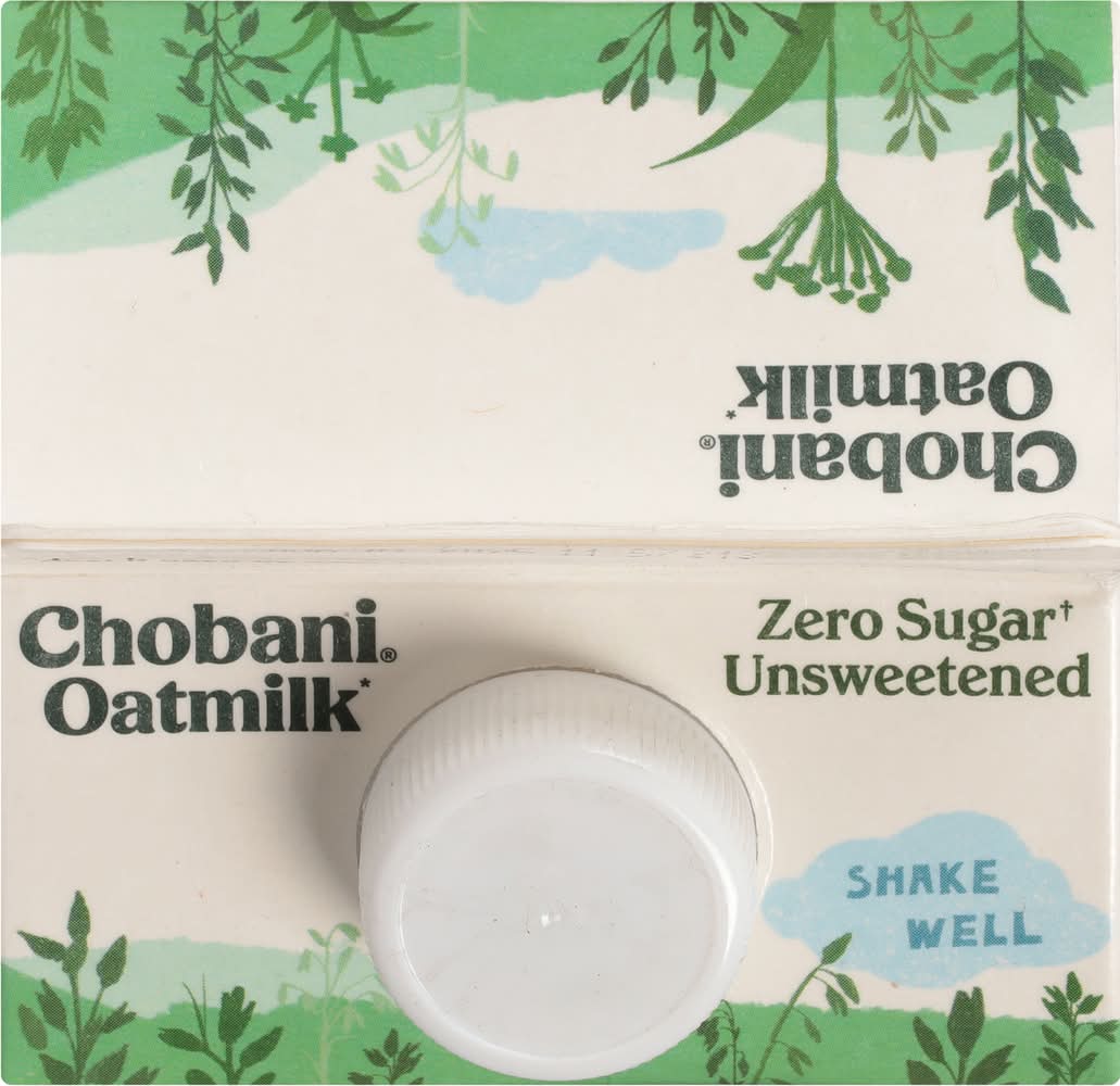 Try Chobani® Oatmilk* Zero Sugar** Unsweetened. Rich and creamy oatmilk with 0g sugar, made with the goodness of whole grain oats, without nuts, dairy, or lactose.Rich and creamy oatmilk with 0g sugar, made with the goodness of whole grain oats, without nuts, dairy, or lactose." Packaging: Reusable