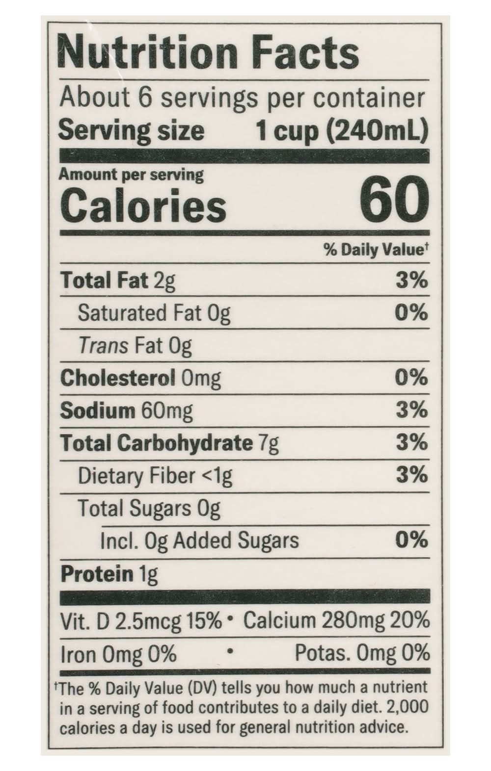 Ingredients: Oat Blend (Water, Whole Grain Oats), Contains 2% or Less of: Rapeseed Oil, Sea Salt, Vitamin D (Yeast Extract), Calcium Carbonate, Gellan Gum Contains: Oat