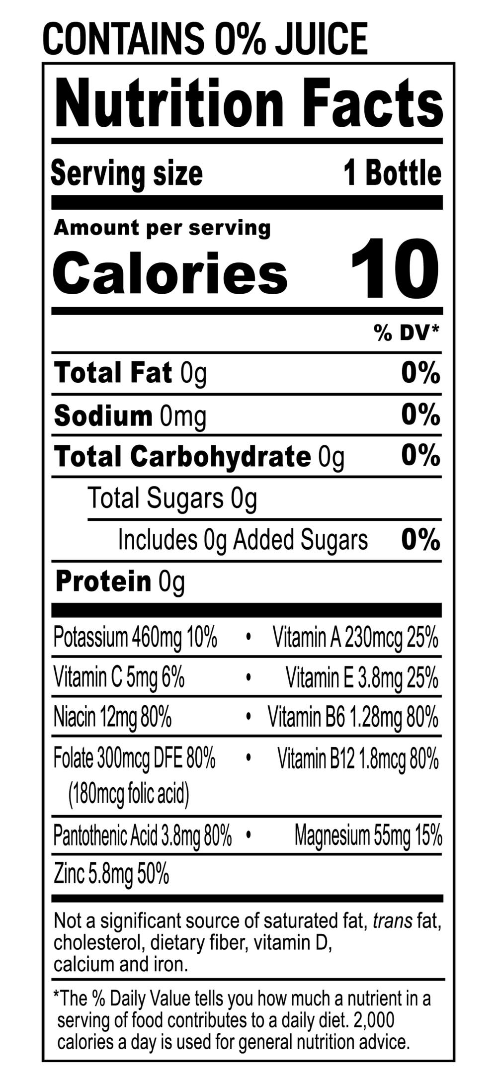 Ingredients: Filtered Water, Citric Acid, Dipotassium Phosphate (Electrolyte), Stevia Sweetener, Magnesium Oxide (Electrolyte), Gum Arabic, Natural Cherry Berry Lime Flavor With Other Natural Flavors, Ester Gum, Ascorbic Acid (Vitamin C), Calcium D-Pantothenante (Vitamin B5), Niacinamide (Vitamin B3), Alpha-Tocopheryl Acetate (Vitamin E), Zinc Oxide (Electrolyte), Pyridoxine Hydrochloride (Vitamin B6), Vitamin A Palmitate (Vitamin A), Folic Acid (Vitamin B9), Cyanocobalamin (Vitamin B12).