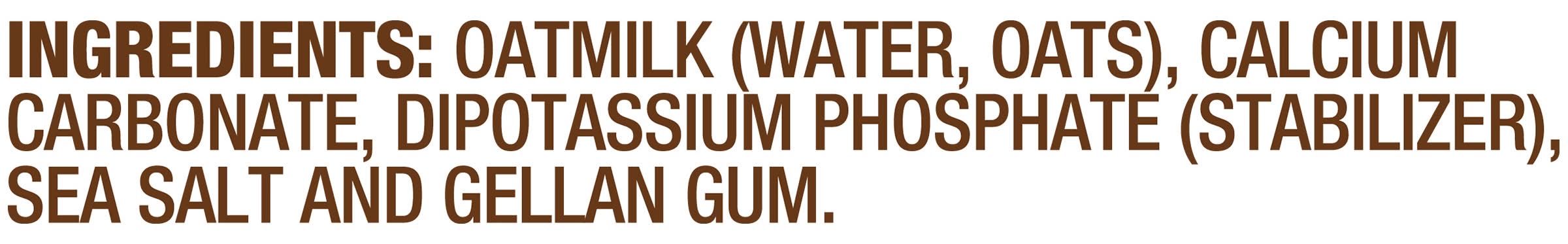 Ingredients: Oatmilk (Filtered Water, Oats), Calcium Carbonate, Dipotassium Phosphate (Stabilizer), Sea Salt and Gellan Gum.