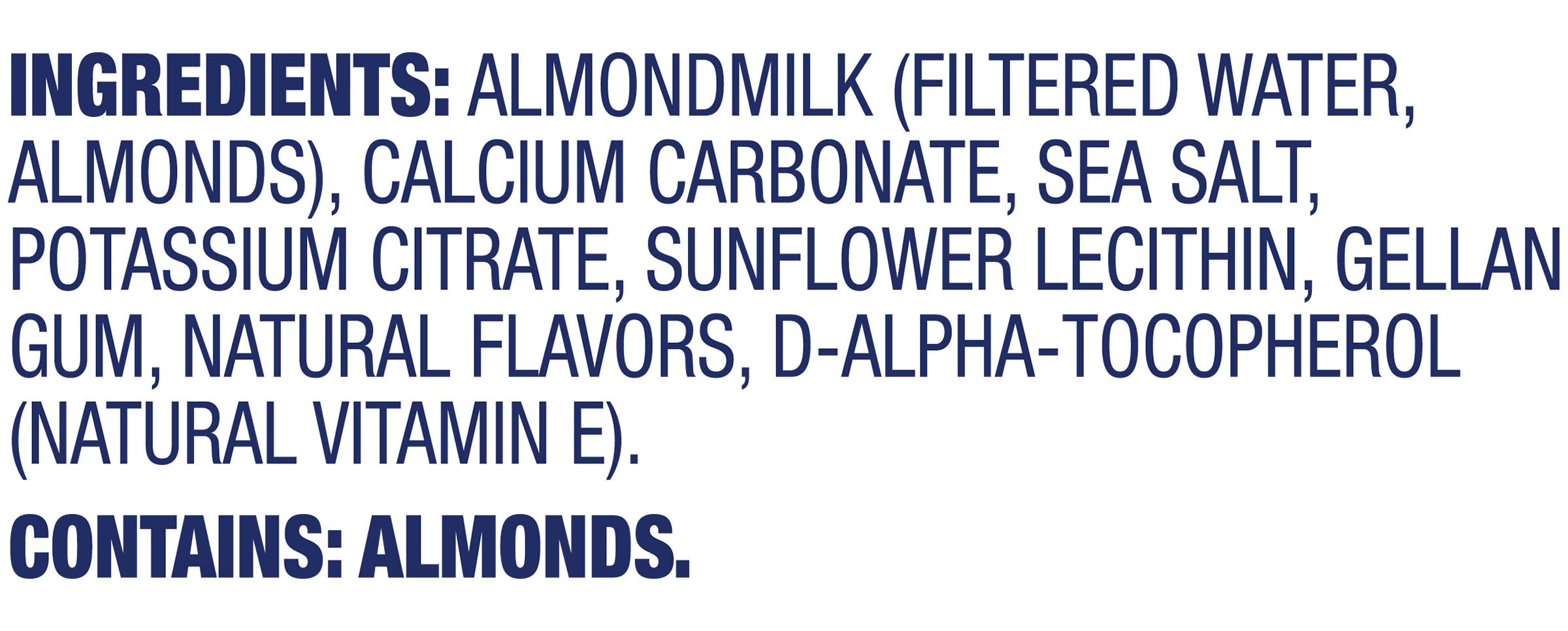 Ingredients: ALMONDMILK (FILTERED WATER, ALMONDS), CALCIUM CARBONATE, SEA SALT, POTASSIUM CITRATE, SUNFLOWER LECITHIN, GELLAN GUM, NATURAL FLAVORS, D-ALPHA-TOCOPHEROL (NATURAL VITAMIN E). Contains: Contains almonds.\nAll products are produced in a stringent allergen control environment.