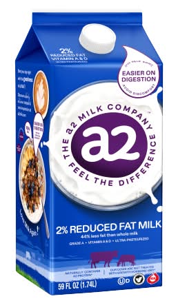 Start your day off right with the deliciously smooth goodness of a2 Milk®. a2 Milk® 2% Reduced Fat Milk is high-quality, real milk from cows that naturally produce ONLY the A2 protein and no A1. It is easier on digestion and published research suggests a2 Milk® may help avoid stomach discomfort in some people. Feel the a2 difference! Ultra-Pasteurized, 59 fl oz. -100% real cow's milk, contains Vitamin A & D-Easier on digestion. May help some avoid discomfort.-Naturally contains A2 protein-8 grams of high-quality protein-Our cows are not treated with growth hormone rBST (no significant difference has been shown between milk from rBST-treated cows and non rBST-treated cows)-Validus certified for animal welfare