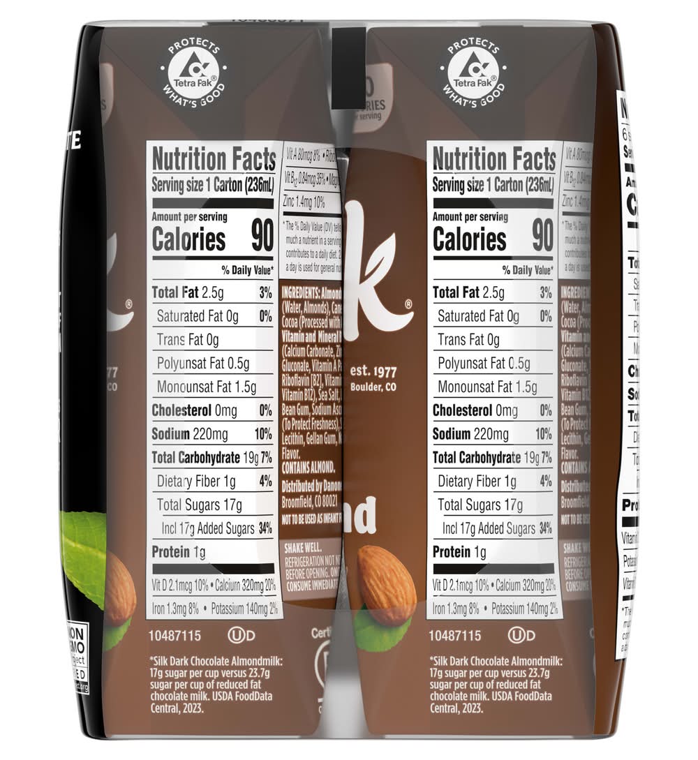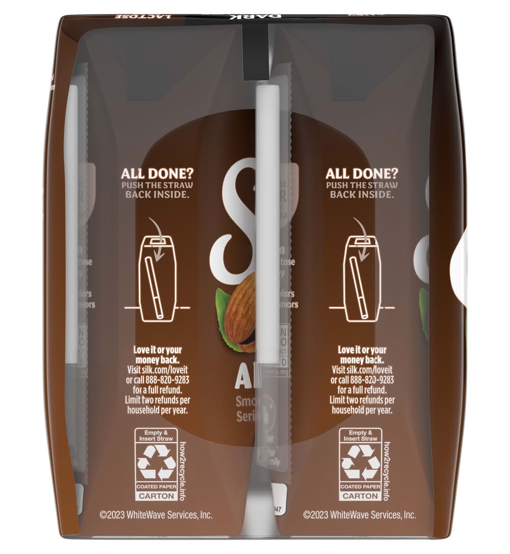 Treat yourself to shelf-stable Silk Dark Chocolate Almondmilk. Made with three types of almonds that are grown by mother nature, this dairy free, gluten free, and lactose free milk is simply delicious. Enjoy all the taste with a indulgent touch of dark chocolate flavor. Plus, it's an extraordinary tasting plant based milk that you can use throughout your day. Every serving of this non dairy milk is an excellent source of calcium and vitamin D to help support strong bones. Silk Almondmilk is free of dairy, lactose, soy, gluten, cholesterol, artificial colors and artificial flavors. This shelf-stable almondmilk doesn’t require refrigeration until after opening, so you can stock up and store this dairy free milk for months without sacrificing taste. Plus, the convenient 8 fl oz carton makes this an on the go drink you can take anywhere. Whether you’re making a bowl of tasty cereal, looking for baking supplies or drinking straight out of a glass, trust Silk — the Original Plant Pioneer. Enjoy more Silk products, including vegan milk, non dairy creamers and dairy free yogurt varieties. • Pack size: 6 • Packaging: Reusable
