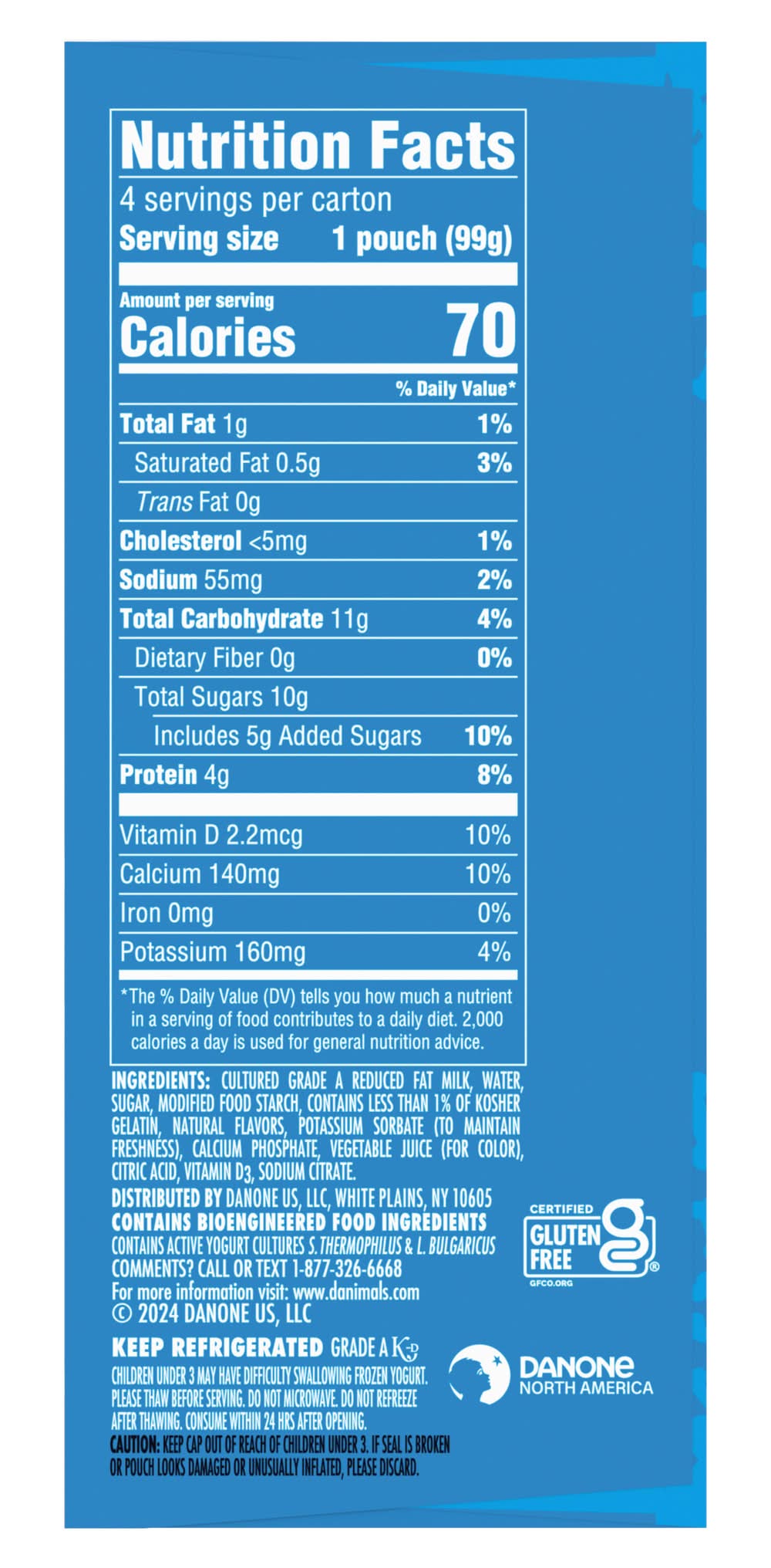 Hop into adventure with Danimals Cotton Candy Pouches. No spoon? No problem. Each squeezable yogurt delivers an explosion of cotton candy flavor on-the-go. With no artificial flavors, high fructose corn syrup or artificial colors, Danimals yogurt pouches easy snacks get high-fives all around. Kids enjoy a neat-o yogurt that’s fun to eat. Parents get a mess-free snack that's also a good source of calcium and vitamin D. Everyone wins. That’s why Danimals is the 1 kids’ brand in the yogurt aisle. It’s the missing puzzle piece in their lunch box, the smooth way to serve breakfast, the kids snack that’s easy to say yes to. Stay extra cool with the Bongo switcheroo—move these low fat yogurt pouches to the freezer overnight for lunch boxes in the morning! Let their imaginations run wild with Danimals smoothies and cups in kid-inspired flavors. With Danimals, you’re ready for adventure – anytime, anywhere. • Flavor: Cotton candy • Pack size: 4 • Danone US, White Plains, NY, 10605 • Packaging: Reusable