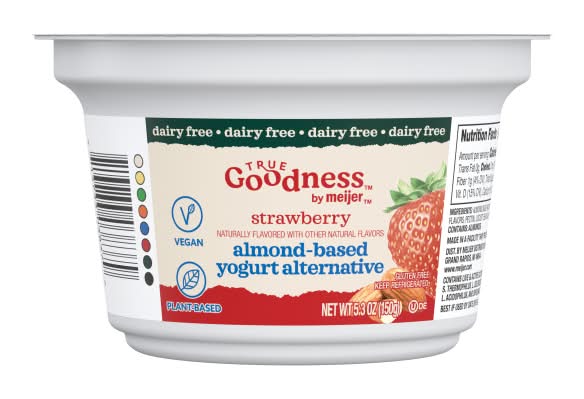 True Goodness Almond Milk Yogurt, Strawberry offers a smooth texture and is made from almond milk. As a plant-based yogurt, it includes probiotics and is strawberry flavored, providing a delightful taste experience for those who prefer dairy-free alternatives.