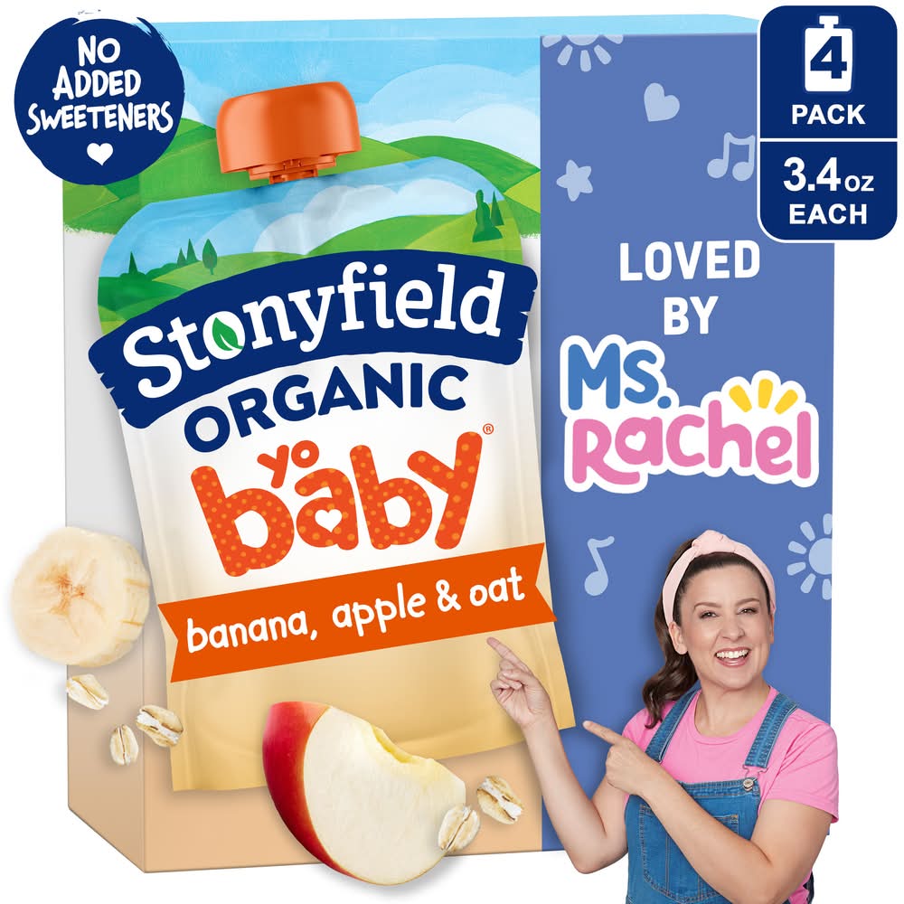 Recommended for babies 6 months - 2 years among refrigerated yogurts Support brain health. This product supports brain health when consumed regularly as part of a balanced diet and healthy lifestyle. 5 live active cultures: S. Thermophilus, L. Bulgaricus, L. Acidophilus, Bifidus, and L. Paracasei. No harmful pesticides. Organic standards prohibit the use of pesticides that are harmful to human health and the environment. • Flavor: Banana apple & oat • Pack size: 4 • Stonyfield Farm, Inc., Londonderry,NH,03053
