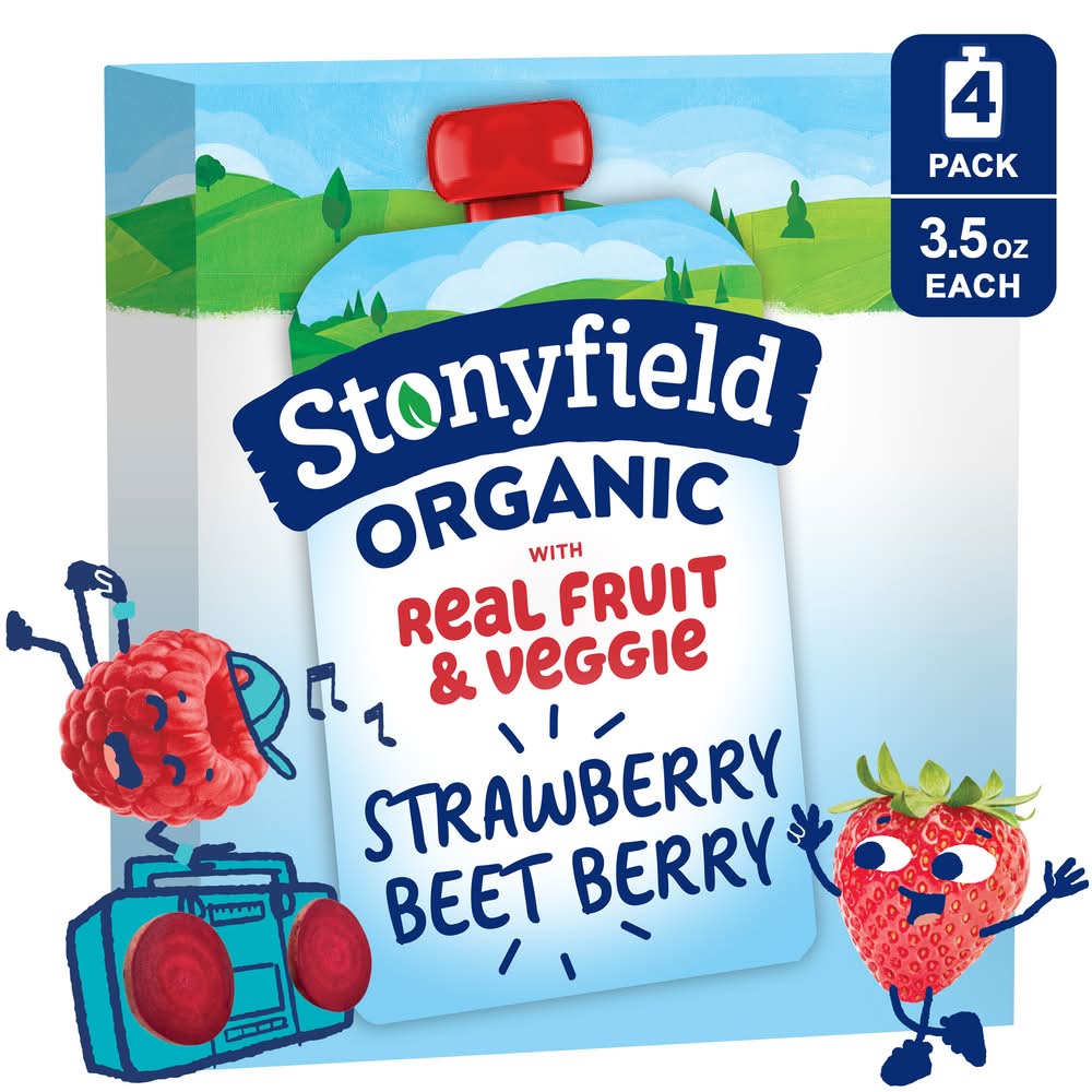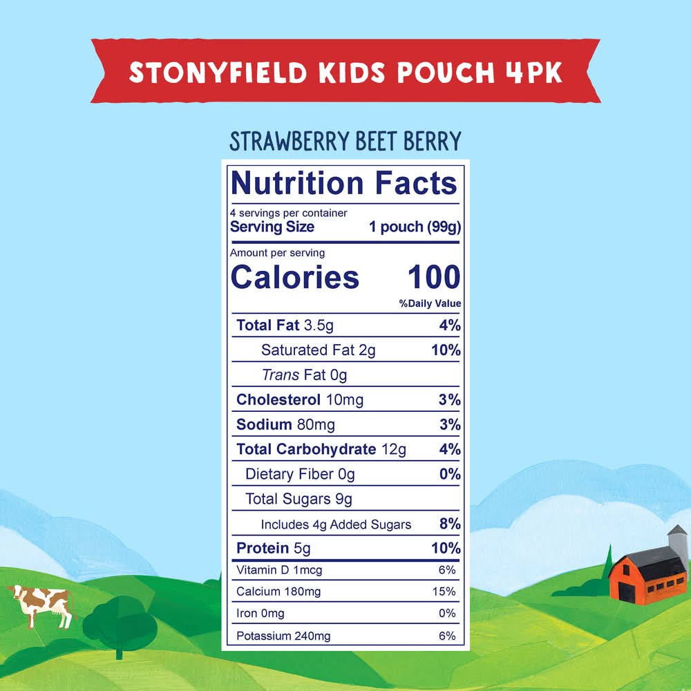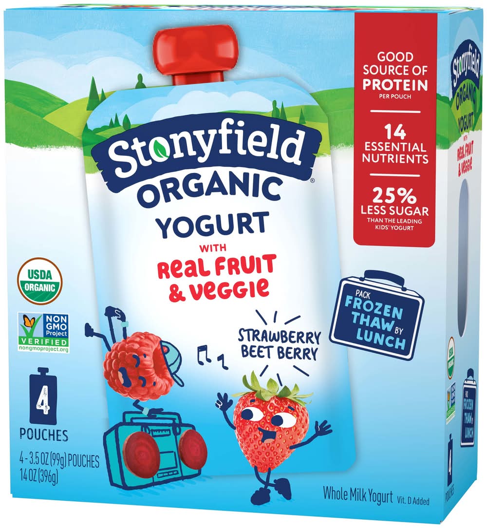 Hungry kids are no picnic. Fix it quick with portable Stonyfield Organic Whole Milk Yogurt Pouches! Make morning yummy with an energy-boosting infusion of protein that's sure to help get your littles out of bed and into the kitchen for breakfast. Or pack a right-size yogurt pouch for lunch, sports, camping, or playtime. We use 100% Grade A milk from pasture-raised cows, live and active cultures, and a variety of flavors made with real fruit and veggie to create a tantalizing snack for kids on the go. Our yogurt is made without the use of toxic persistent pesticides, antibiotics, artificial growth hormones, or genetically modified organisms (GMOs), protecting growing kids for the long haul and contributing to a healthy and sustainable world. With fresh taste, high-quality ingredients, and no added nonsense, Stonyfield Organic Yogurt for kids is #goodonpurpose! • Flavor: Strawberry beet berry • Pack size: 4