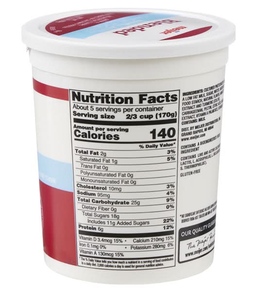 Meijer Vanilla Lowfat Yogurt is a type of yogurt noted for its sweet taste. It is suitable for consumption as either a breakfast option or a snack. This yogurt contains protein and vitamin D, contributing to its nutritional profile. It offers versatility in culinary uses; it can be used in various meals, topped with fruit or granola, or added to smoothies to enhance flavor. Flavor: Vanilla
