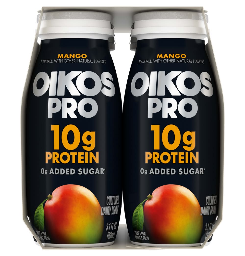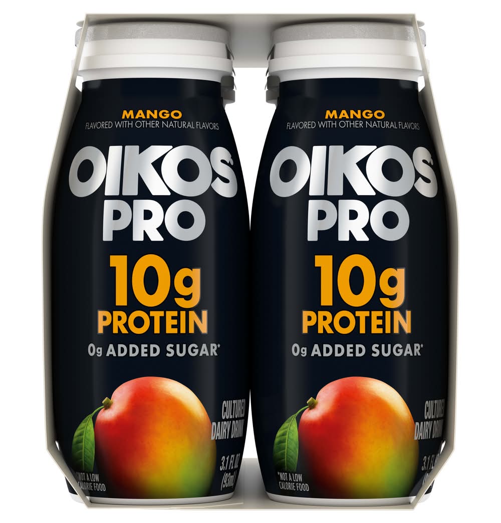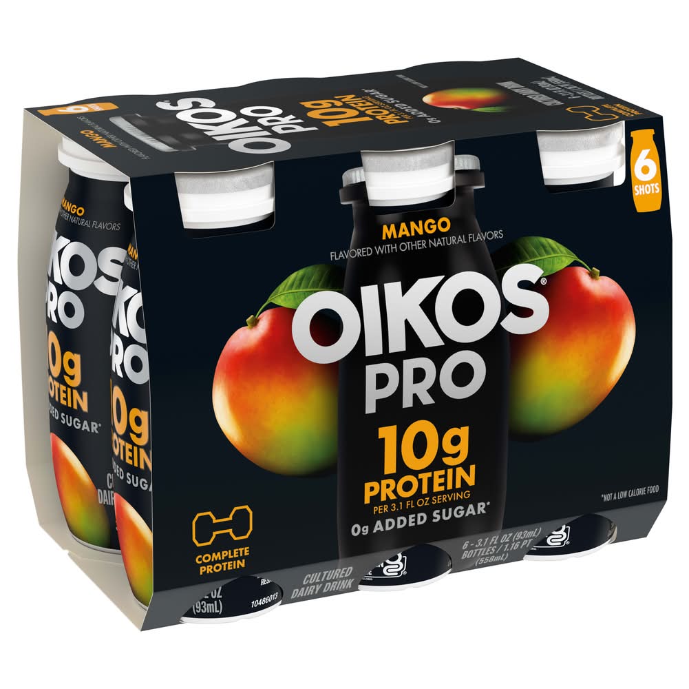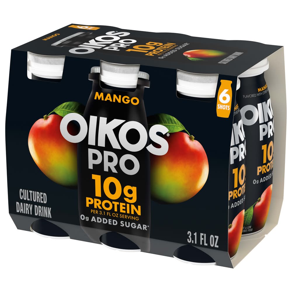 Go Pro with Oikos Pro Shots Mango Cultured Dairy Drink, the anytime snack with more of what you want, and less of what you don’t. Every 3.1 fl oz serving contains 9 essential amino acids, in addition to vitamins B2, B6 and B12. There’s 0g of added sugar* per 3.1 fl oz serving, and no artificial flavors or colors from artificial sources. Our cultured dairy drink packs a punch with 10g of protein, so you can always have dependable, high protein snacks to help you add more protein to your day. Because when you feel strong, you are unstoppable. With complete protein and deliciousness, these snacks can help you strive to reach your potential with every serving. Protein is important - an essential nutrient that we need in our diet - and Oikos Pro cups are great tasting, convenient solutions for adding complete protein every day. Grab these on the go snacks for days that start at a sprint, enjoy a delicious boost of protein at lunch, add a creamy boost to your protein shake, or pack a bottle for a protein boost for your workout for a customizable daily protein routine. For more reasons to go Pro, Oikos Pro snack cups have you covered with 20g of protein per 5.3 oz serving. Need 0g added sugar,* 0 artificial sweeteners, and 0% fat? Try Oikos Triple Zero with 15g of protein per 5.3 oz serving. Oikos — Stronger Makes Everything Better (R). *Not a low-calorie food. • Flavor: Mango • Pack size: 6