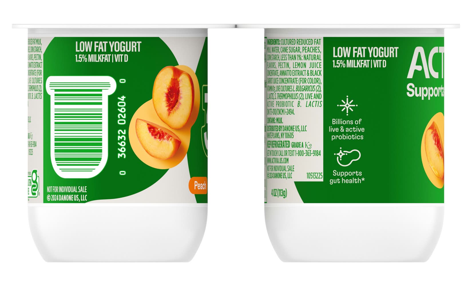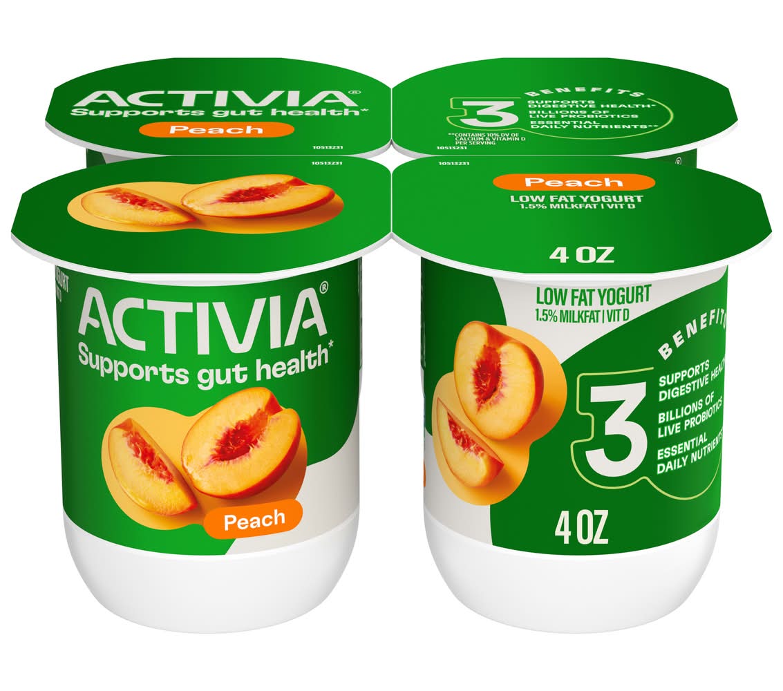 Start your day with your gut health in mind with Activia Probiotic Peach Low Fat Yogurt Cups, from the #1 doctor-recommended probiotic brand.*** Every spoonful is loaded with delicious flavor and creamy texture. Backed by 20 years of gut health research and innovation, this refreshingly smooth peach yogurt contains billions of probiotics, 5 live cultures and essential nutrients.** Probiotics are the living microorganisms that have been studied and shown to provide specific health benefits, including supporting gut health.* Making Activia probiotic yogurt a part of your daily routine is an easy way to help support your gut health.* Grab an Activia yogurt for part of an easy and delicious breakfast, mix it into a yogurt smoothie, or enjoy one in the afternoon as an on the go snack. Your gut is where it all begins. Start with Activia. *Enjoying Activia twice a day for two weeks as part of a balanced diet and healthy lifestyle may help reduce the frequency of minor digestive discomfort, which includes gas, bloating, rumbling, and abdominal discomfort. **Contains at least 10% DV of calcium & vitamin D per serving. ***Based on a 2024 national weighted survey of doctors (Primary Care, OBGYN, Gastroenterologist). Flavor: Peach