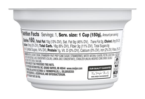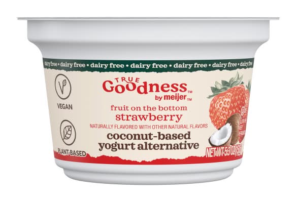 True Goodness Coconut Milk Yogurt offers a strawberry flavor with fruit on the bottom. This Greek-style yogurt is plant-based and includes probiotics.