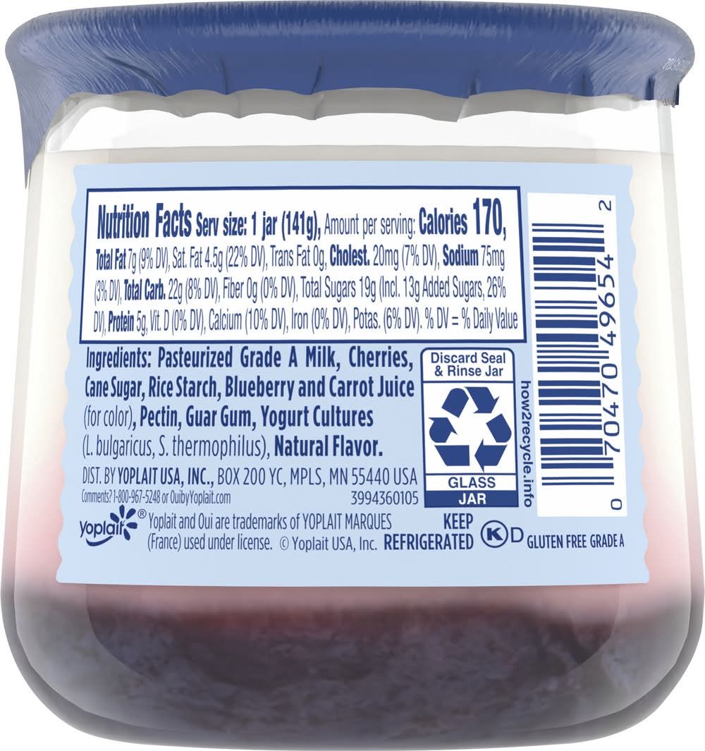 Enjoy the moment with every spoonful of Oui by Yoplait French Style Whole Milk Yogurt. Pleasure is at the heart of this French style yogurt. The culturing process creates a delicious fruit yogurt so thick and creamy, it calls for a proper spoon. So take the time to truly taste. And let your senses be your guide. Enjoy this crafted yogurt cup on a train trip into the city. Take the yogurt jar to the sunniest room at your workplace. Savor spoonful's as a gluten free snack on a bench outdoors. Each yogurt is made with live and active cultures and contains no artificial flavors and no colors from artificial sources. Oui yogurt is best experienced without stirring to get just the right amount of fruit from the bottom in every bite. The glass pot protects the delicate, creamy texture while the yogurt sets, as well as during shipping. The result is unparalleled taste and texture for a uniquely French yogurt experience. • Flavor: Black cherry • Yoplait USA, Inc., Box 200 YC,Mpls,MN,55440,USA • Packaging: Reusable