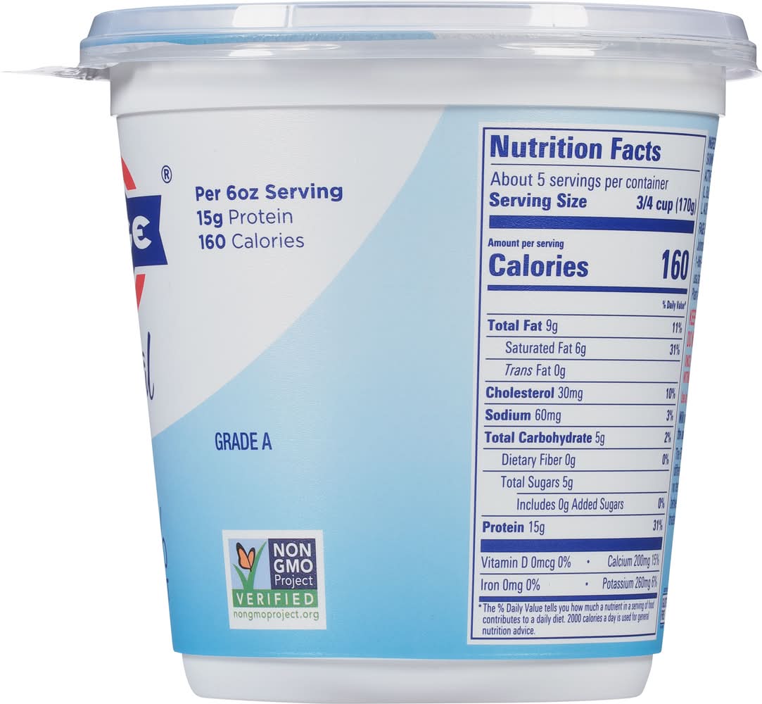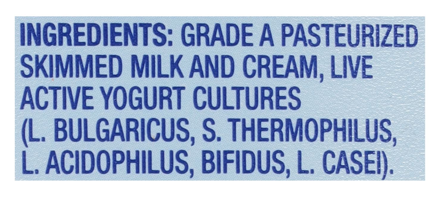 Ingredients: Grade A Pasteurized Skimmed Milk and Cream, Live Active Yogurt Cultures (L. Bulgaricus, S. Thermophilus, L. Acidophilus, Bifidus, L. Casei) Contains: Milk
