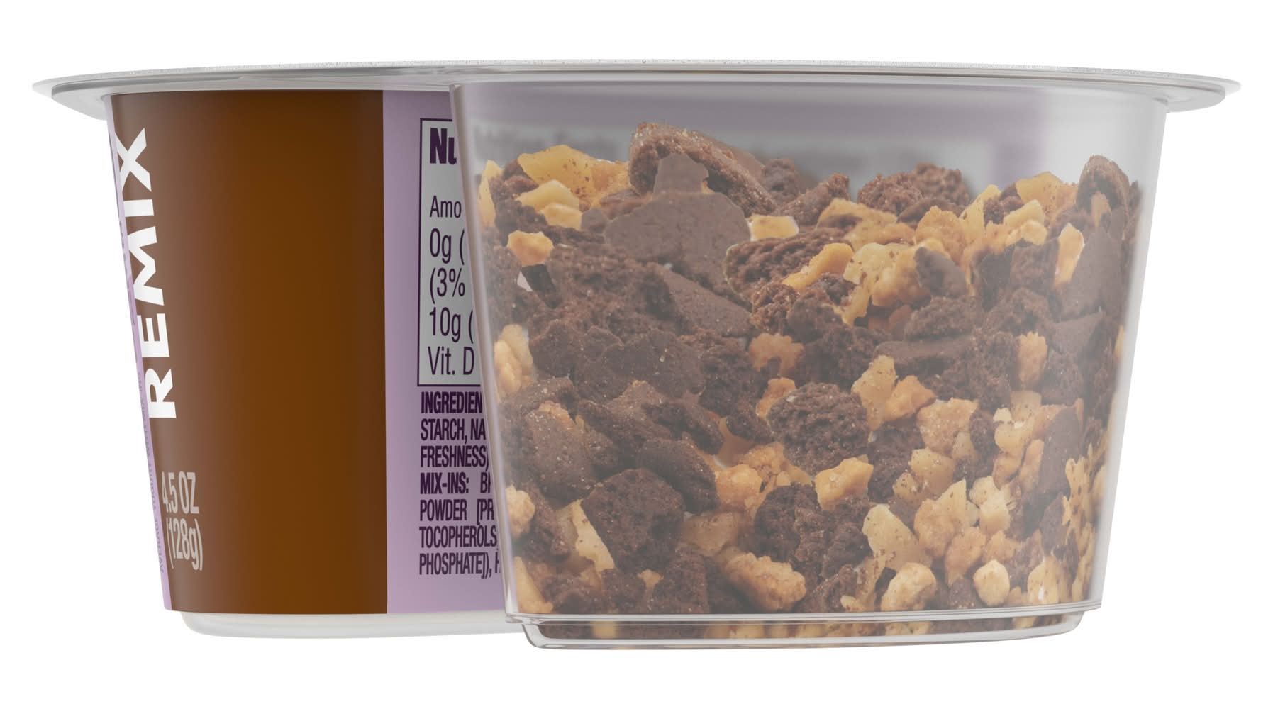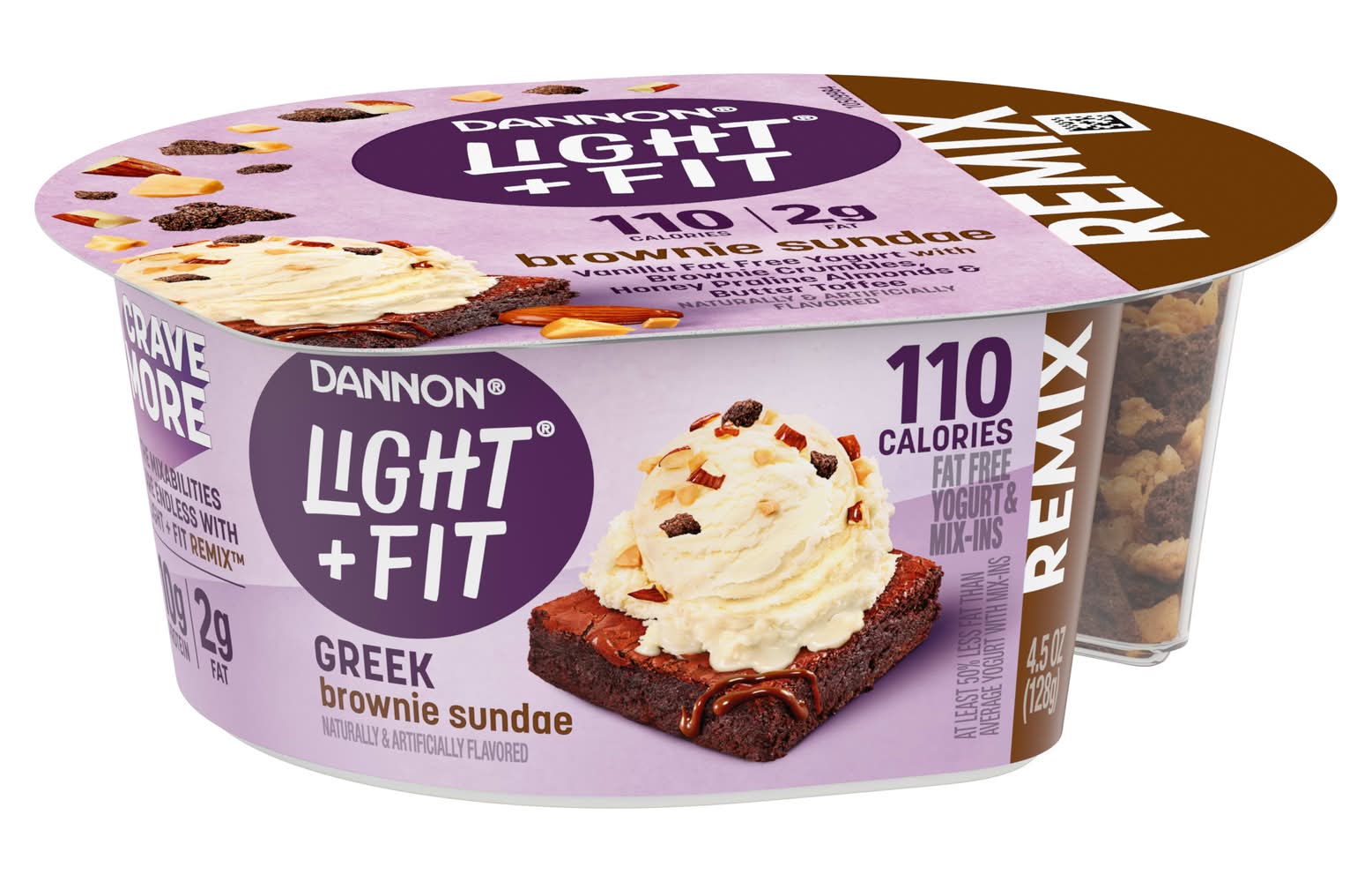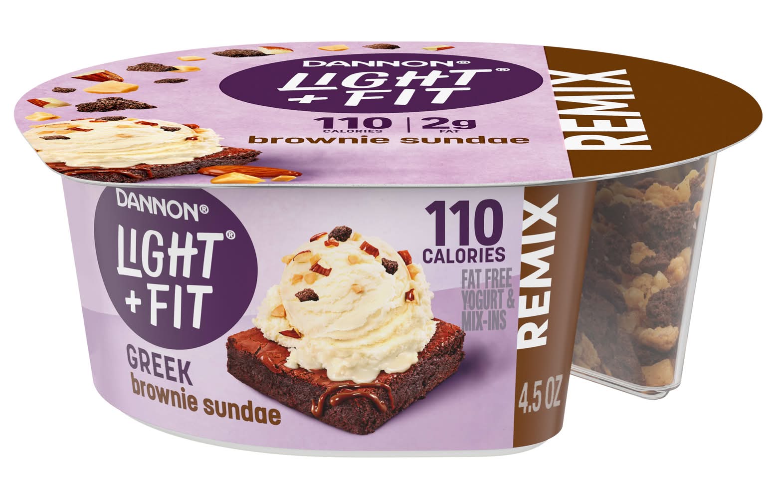 Looking for a delicious fat free yogurt with a fierce flavor and craveable mix-ins? Give your taste buds a reason to rejoice with Dannon Light + Fit REMIX Brownie Sundae Vanilla Fat Free Greek Yogurt with Brownie Crumbles, Honey Praline Almonds and Butter Toffee Mix-Ins. Remix your snacks and treat yourself with brownie crumbles, honey praline almonds and butter toffee over Greek vanilla fat free yogurt. Every bite of this REMIX light yogurt* snack cup has a taste that just keeps bringing it, making it easy to enjoy snacks you can feel good about having on repeat. At Light + Fit, our goal is to help you do you while balancing a healthy diet by serving up some delightfully creamy Greek yogurt with sensational flavor. Light + Fit REMIX fat free Greek yogurt come in single-serve cups, so you can live your life uninterrupted and enjoy them on the go. Protein is an essential nutrient we need in our diets, and with 110 calories and 10 grams of protein per 4.5 ounce serving, this Light + Fit yogurt is a deliciously satisfying and convenient option for adding complete protein every day. Knockout taste. Epic mix-ins. Snacking mic-drops. That’s REMIX. It’s the party crew of snacking you can feel great about. Go full-on fierce, mix it up and take your snacking routine to anything but routine. Pack a few Light + Fit REMIX yogurt cups and enjoy at work or as an on the go snack. Or grab a cup to make breakfast and home snacking more craveable. The mixabilities are endless with Light + Fit REMIX. *50% less fat than average yogurt with mix-ins; Light & Fit Remix: 110 calories, 2g fat; Average yogurt with mix-ins: 155 calories, 4g fat per 4.5oz Packaging: Reusable