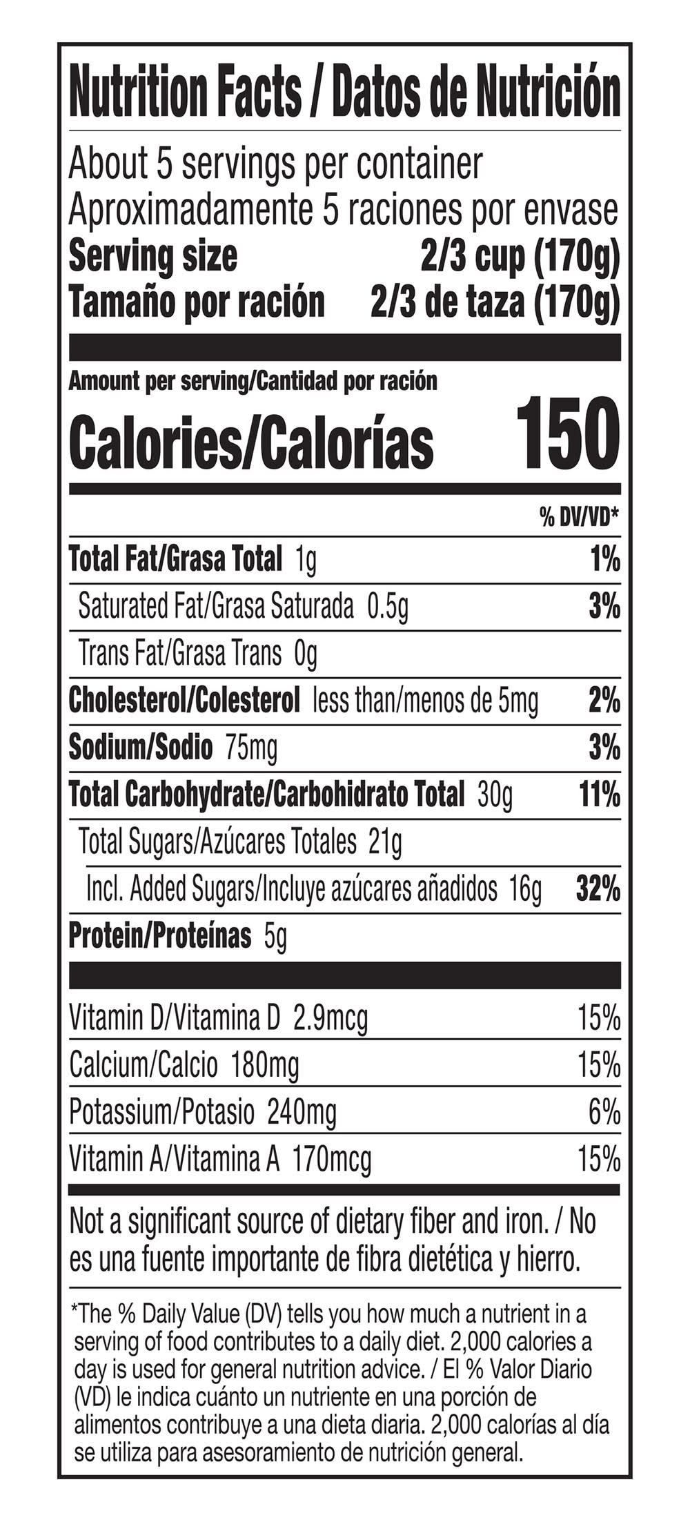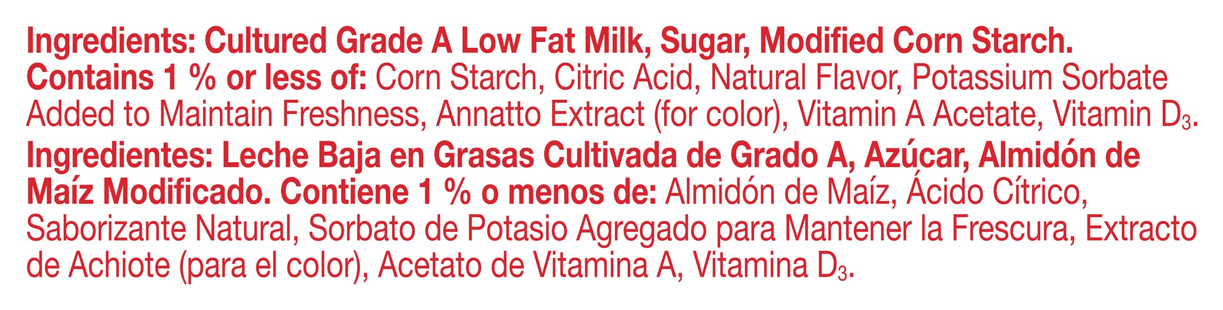 Ingredients: Cultured Grade A Low Fat Milk, Sugar, Modified Corn Starch, Contains 1% or Less of: Corn Starch, Citric Acid, Natural Flavor, Potassium Sorbate Added to Maintain Freshness, Annatto Extract (for Color), Vitamin A Acetate, Vitamin D3 Contains: 'Contains Milk'