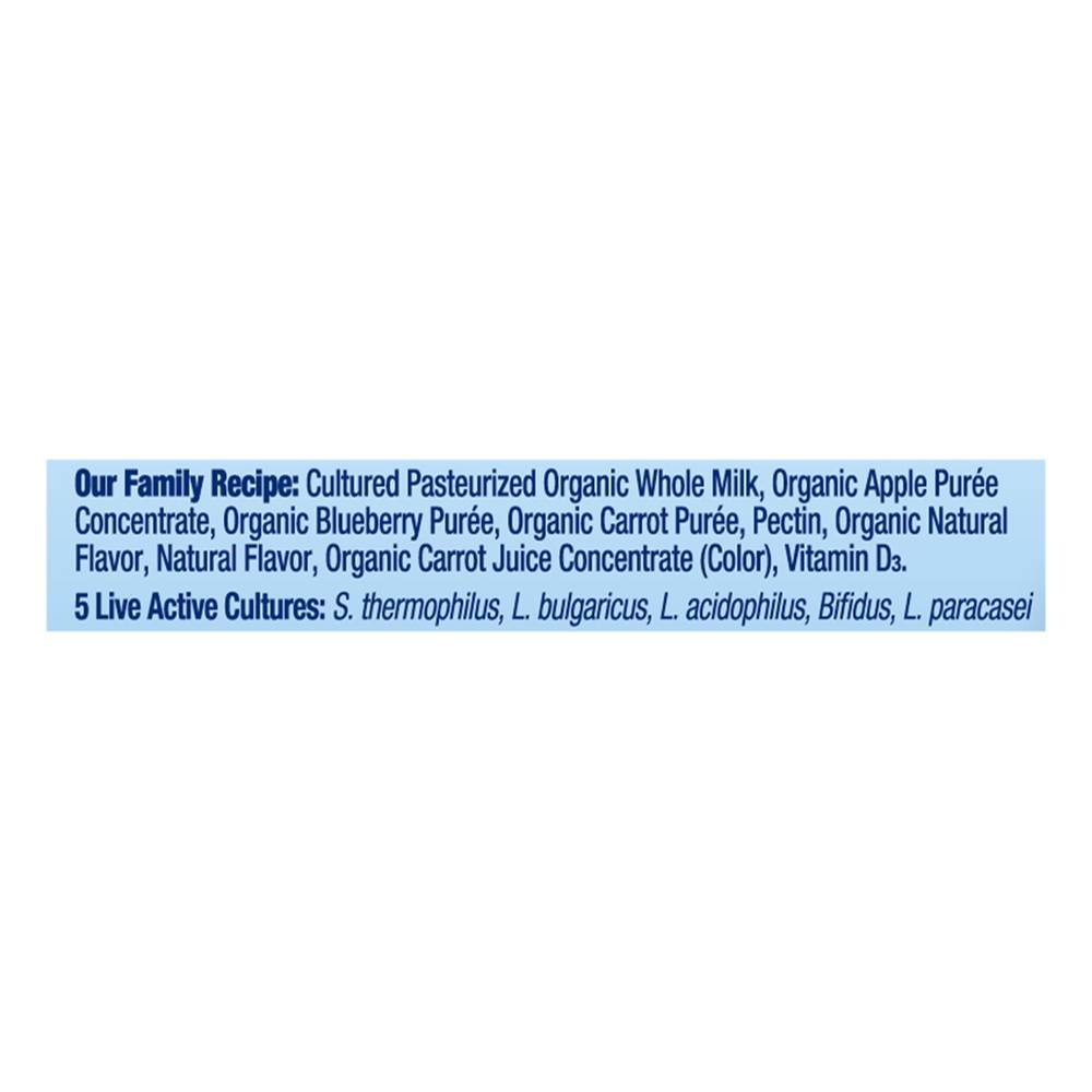 Ingredients: Our Family Recipe: Cultured Pasteurized Organic Whole Milk, Organic Apple Puree Concentrate, Organic Blueberry Purée, Organic Carrot Purée, Pectin, Organic Natural Flavor, Natural Flavor, Organic Carrot Juice Concentrate (Color), Vitamin D3. 5 Live Active Cultures: S. Thermophilus, L. Bulgaricus, L. Acidophilus, Bifidus, Paracasei Contains: Milk