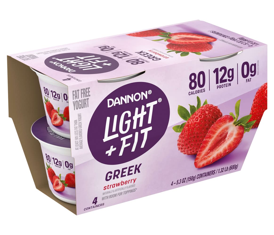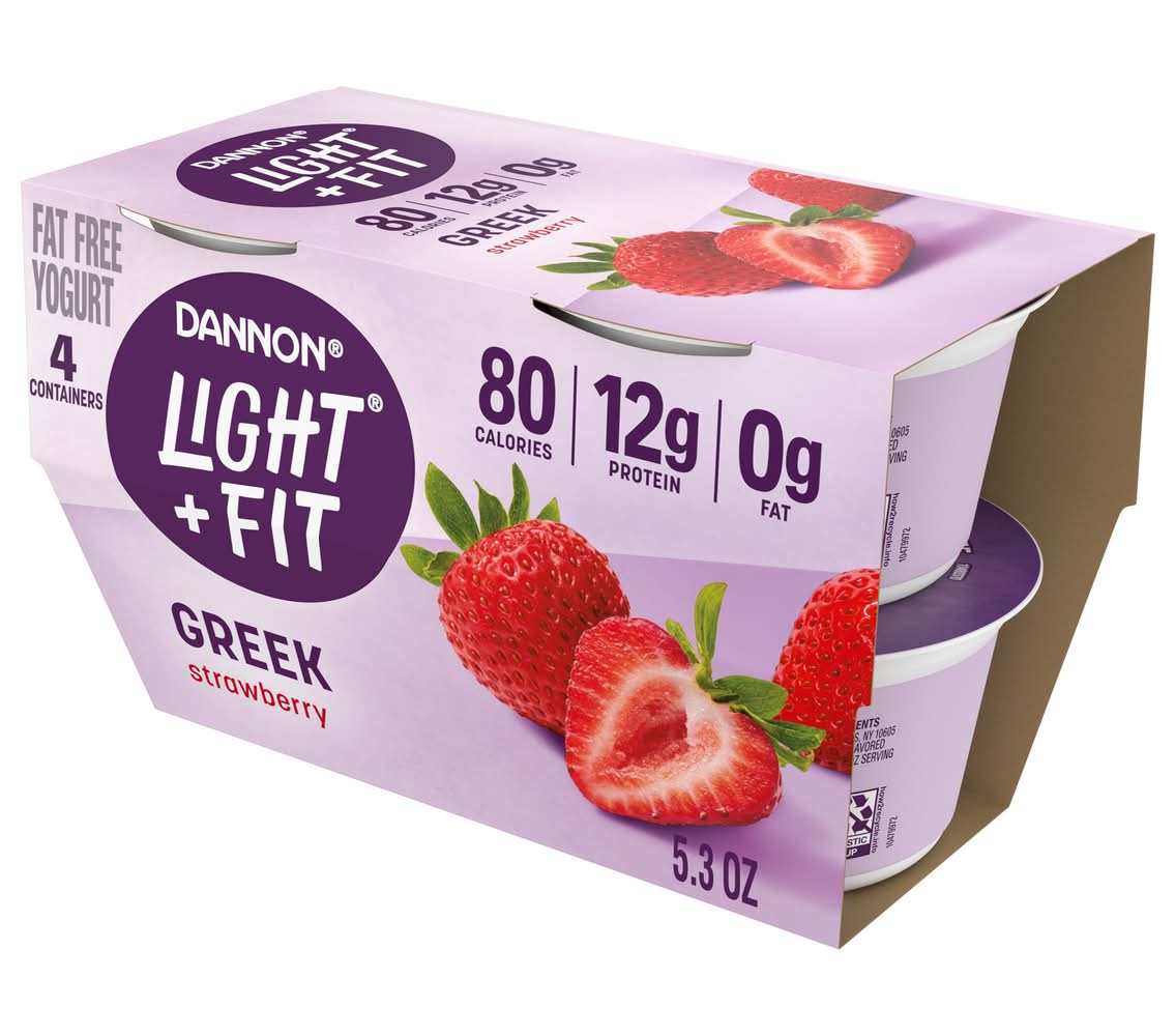 Looking for a gluten free, fat free yogurt with crave-able strawberry flavor? Give your taste buds a reason to rejoice with a four-pack of Dannon Light + Fit Strawberry Greek Fat Free Yogurt Cup. Every bite of this strawberry flavored yogurt makes it easy to enjoy fat free snacks with this delicious light yogurt brand.* At Light + Fit, our goal is to help you do you while balancing a healthy diet by serving up delightfully creamy Greek yogurt with sensational flavor. Our fat free Greek yogurt comes in single-serve cups, so you can enjoy them on the go. And with 80 calories and 12g of protein per 5.3 ounce serving, its a delicious option that can help you stick to a healthy routine. Pack a cup and enjoy it at work or as a post-workout snack. Add one to breakfast parfaits, smoothies or your favorite recipes. Add fierce flavor to your day, every day, with a single serving snack cup of Dannon Light + Fit Strawberry Greek Fat Free Yogurt. *At least 50% less fat than average flavored Greek yogurt; Light & Fit: 80 calories, 0g fat; Average flavored Greek yogurt: 110 calories, 1g fat per 5.3 oz serving • Flavor: Strawberry • Pack size: 4 • The Dannon Company, Inc., White Plains,NY,10605 • Packaging: Reusable