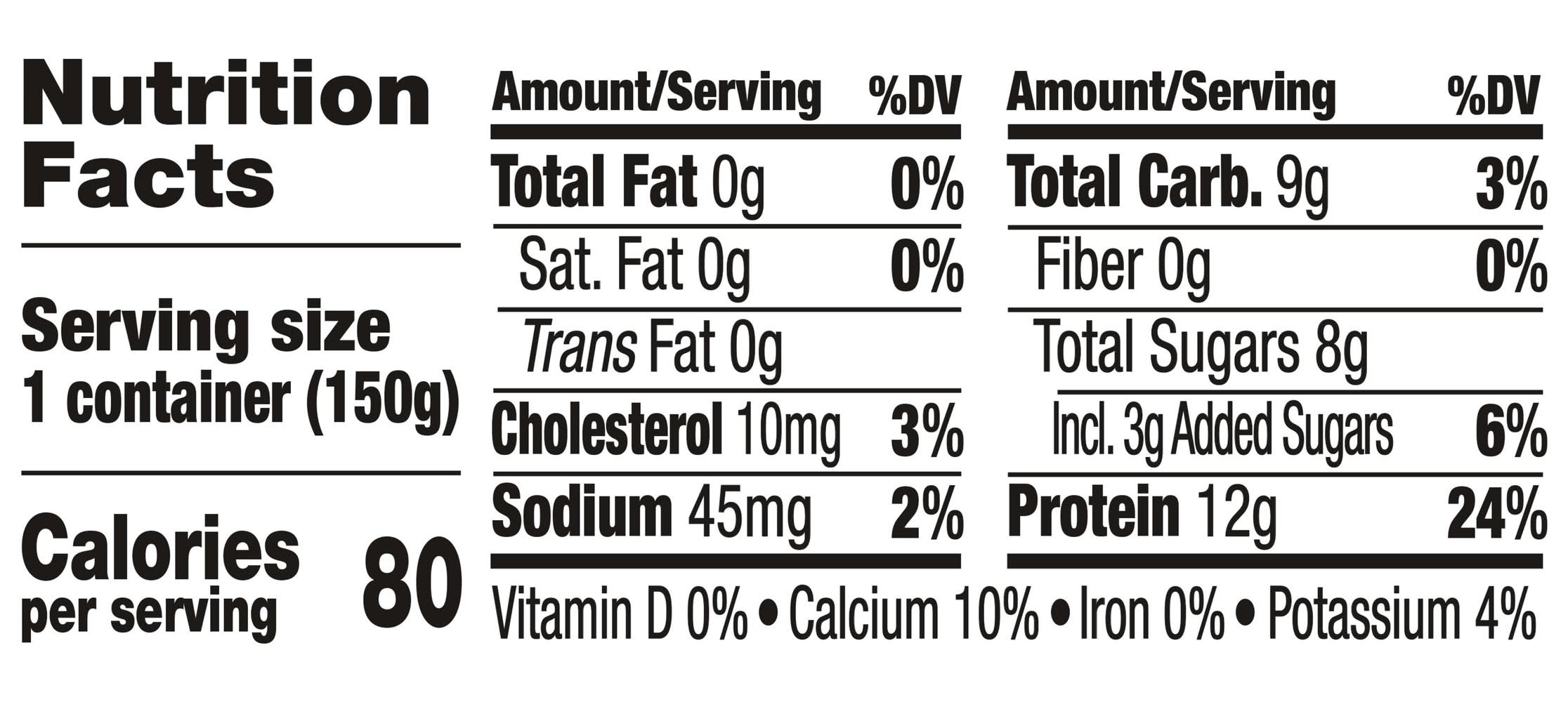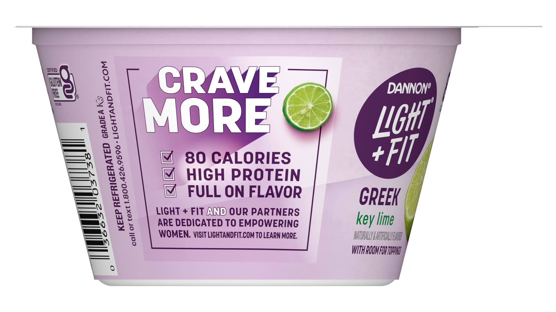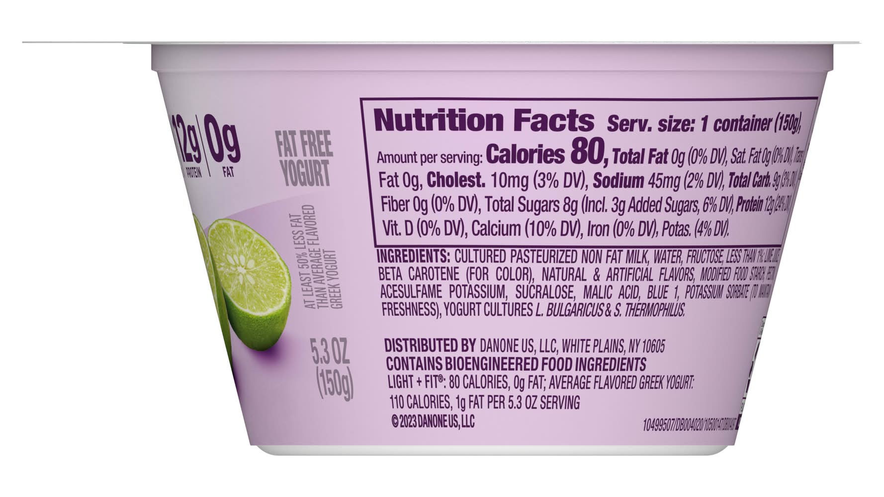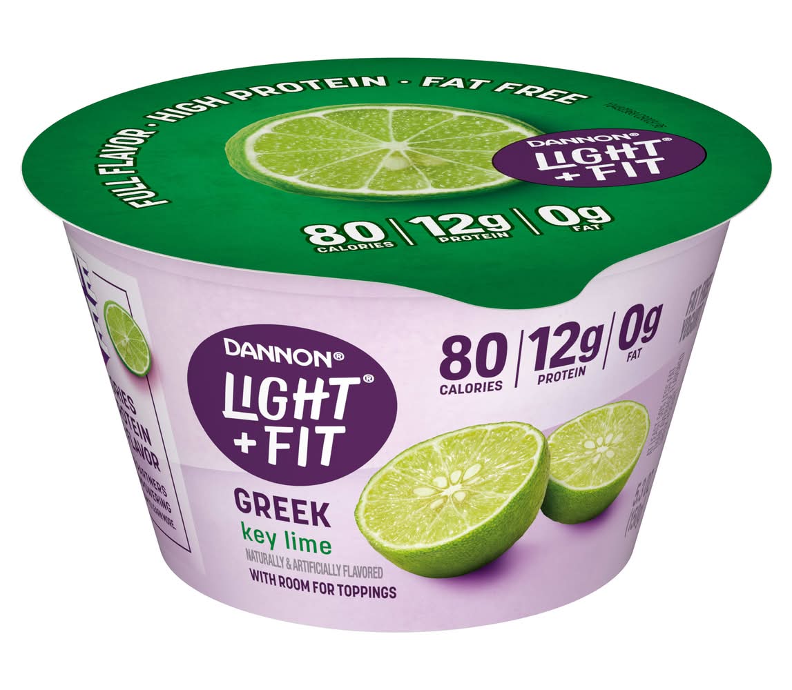 Looking for a delicious fat free yogurt with crave-able, sweet and tart lime flavor? Give your taste buds a reason to rejoice with Dannon Light + Fit Key Lime Greek Fat Free Yogurt. Every bite of this key lime flavored yogurt makes it easy to enjoy fat free snacks with this delicious light yogurt brand.* At Light + Fit, our goal is to help you do you by serving up some delightfully creamy Greek yogurt with sensational flavor. Our fat free Greek yogurt comes in single-serve cups, so you can live your life uninterrupted and enjoy them on the go. Protein is an essential nutrient we need in our diets, and with 80 calories and 12g of protein per 5.3 ounce serving, this Light + Fit yogurt is a deliciously satisfying and convenient option for adding complete protein every day. Pack a cup and enjoy it as a snack cup at work or as a late-night snack. Add a 5.3 oz yogurt cup to your breakfast parfaits and smoothies or use some in your favorite recipes as a flavorful substitute for baking ingredients. Plus, these key lime flavored 5.3 oz yogurt cups are perfect to enjoy as a protein-rich dessert or treat for any time. Add flavor to your day, every day, with a single serving snack cup of Dannon Light + Fit Key Lime Greek Fat Free Yogurt. *At least 50% less fat than average flavored Greek yogurt; Light & Fit: 80 calories, 0g fat; Average flavored Greek yogurt: 110 calories, 1g fat per 5.3 oz serving. **Consult your Healthcare Professional to learn how Light & Fit Greek yogurt can be included as part of a balanced diet. Dannon, White Plains, NY 10603
