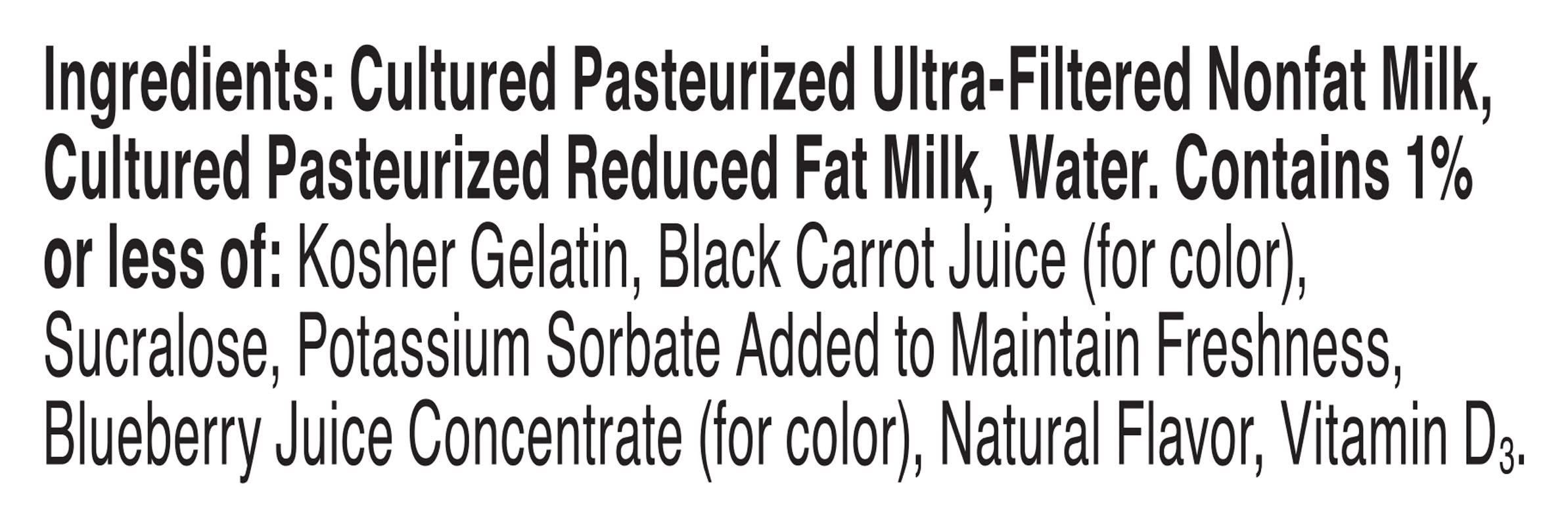 Ingredients: Cultured Pasteurized Ultra-Filtered Nonfat Milk, Cultured Pasteurized Reduced Fat Milk, Water. Contains 1% or Less of: Kosher Gelatin, Black Carrot Juice (for Color), Sucralose, Potassium Sorbate Added to Maintain Freshness, Blueberry Juice Concentrate (for Color), Natural Flavor, Vitamin D3 Contains: Milk