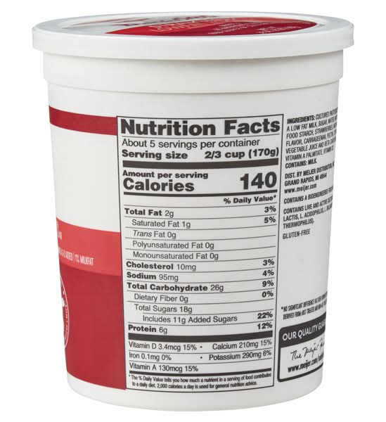 Meijer Strawberry Lowfat Yogurt (32 oz) is a type of healthy yogurt known for its versatility, suitable for breakfast, snacks, or even as a sweet dessert. Rich in protein and vitamins, this yogurt can be enjoyed on its own or enhanced with toppings such as fruit or granola. Additionally, it serves as a flavorful addition to smoothies. Flavor: Strawberry