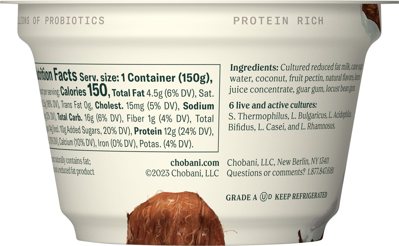 Creamy, nutty, wild, warm-weather flavor from a far-away beachreal coconut blended with cool Chobani® Greek Yogurt. Crafted with only natural ingredients. • Flavor: Coconut • Chobani, New Berlin, Ny, 13411.