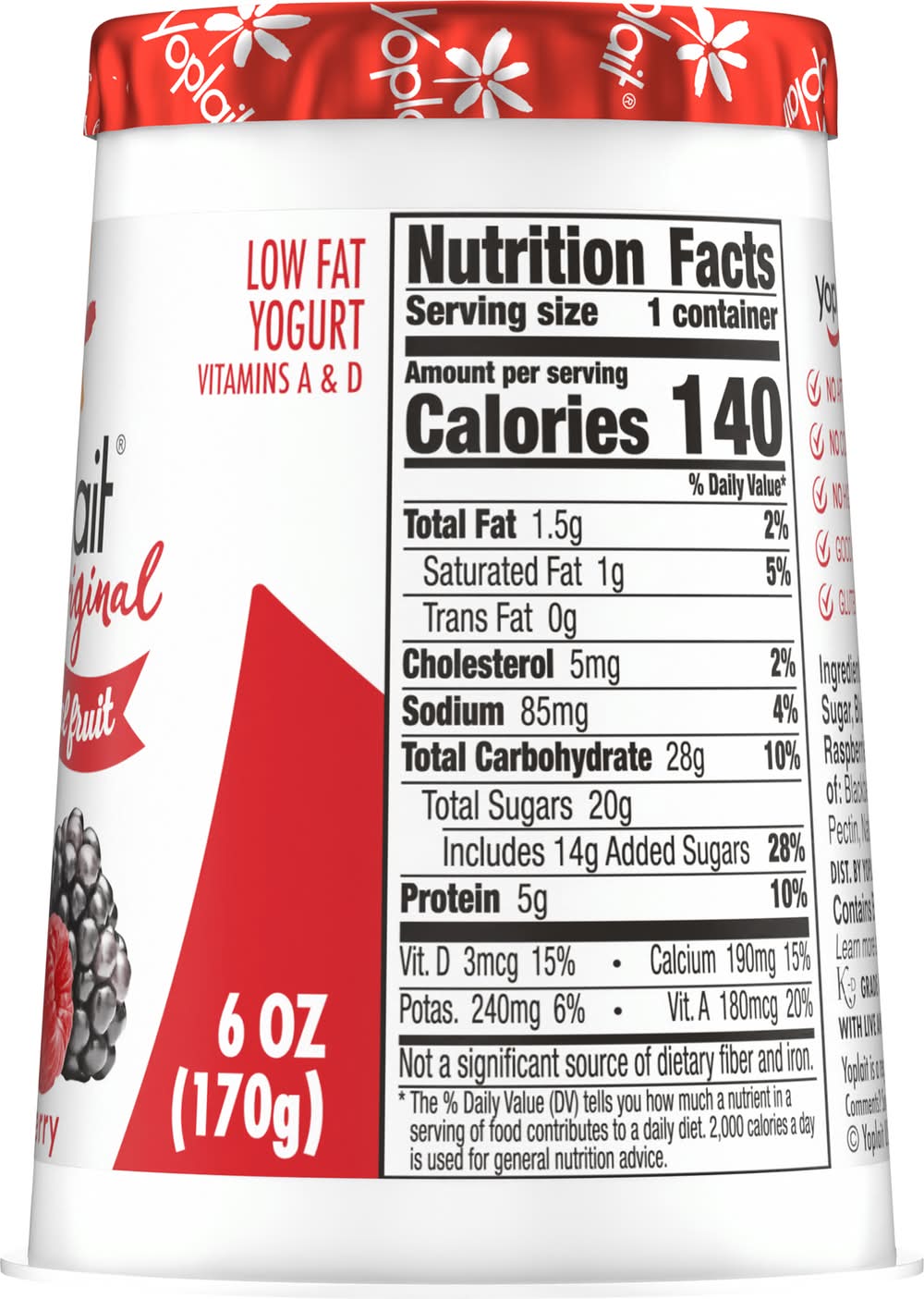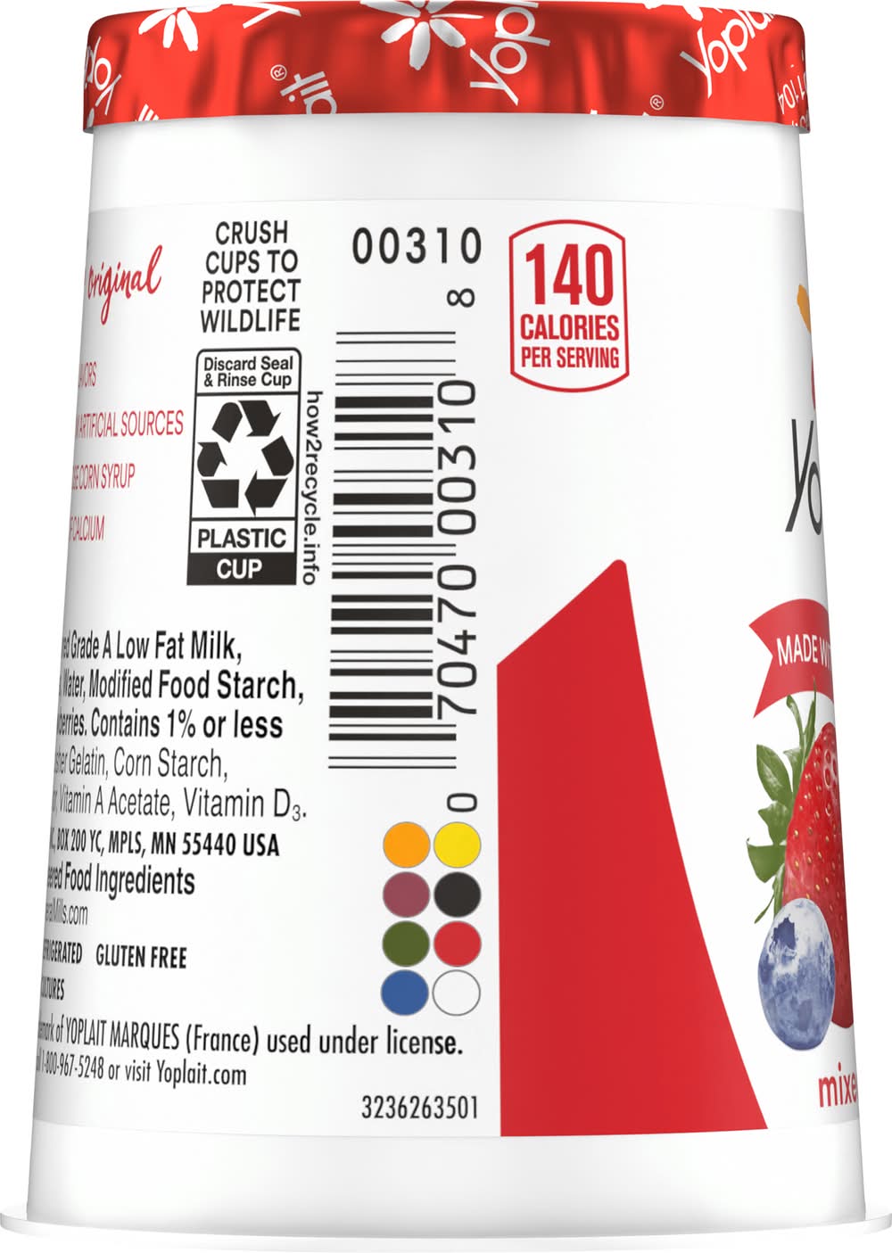 Delicious addition to an easy breakfast or snack! Made with real fruit, plus live and active yogurt cultures, there are no artificial flavors or colors from artificial sources, and no high fructose corn syrup. Each serving contains vitamins A and D, is a good source of calcium, and is gluten free. Enjoy the yogurt plain, pair it with granola, or blend into a refreshing mixed berry yogurt smoothie. Make it a tasty alternative to Greek yogurt. Grab a convenient yogurt cup as a part of breakfast to go. Or stock up for quick snacks for the family. Also try our other Yoplait Yogurt varieties, such as low fat French vanilla yogurt and low fat strawberry yogurt. Yoplait brings goodness to everyday moments, one serving of yum at a time. • Flavor: Mixed berry • Yoplait USA, Inc., Box 200 YC,Mpls,MN,55440,USA • Packaging: Reusable