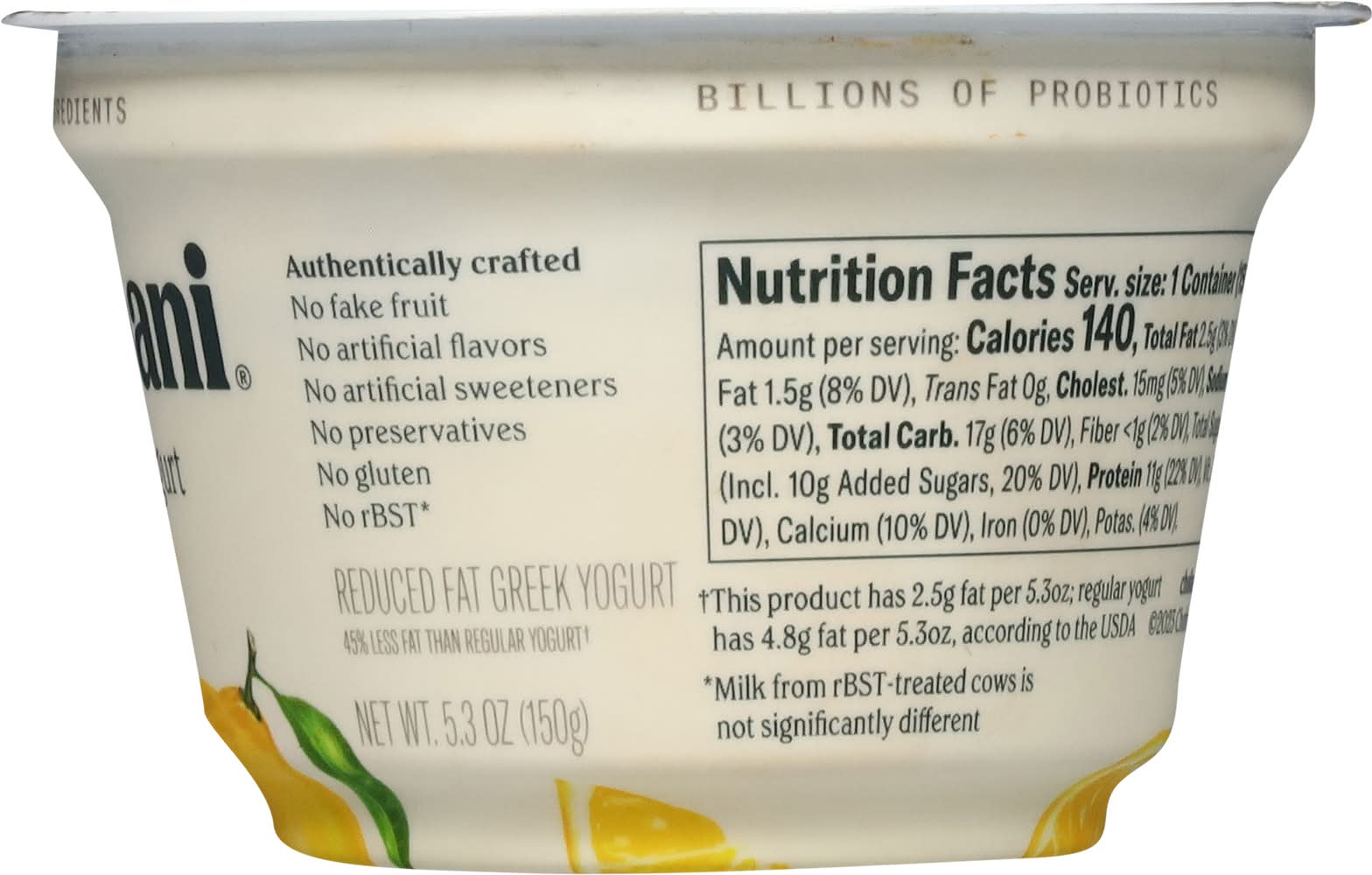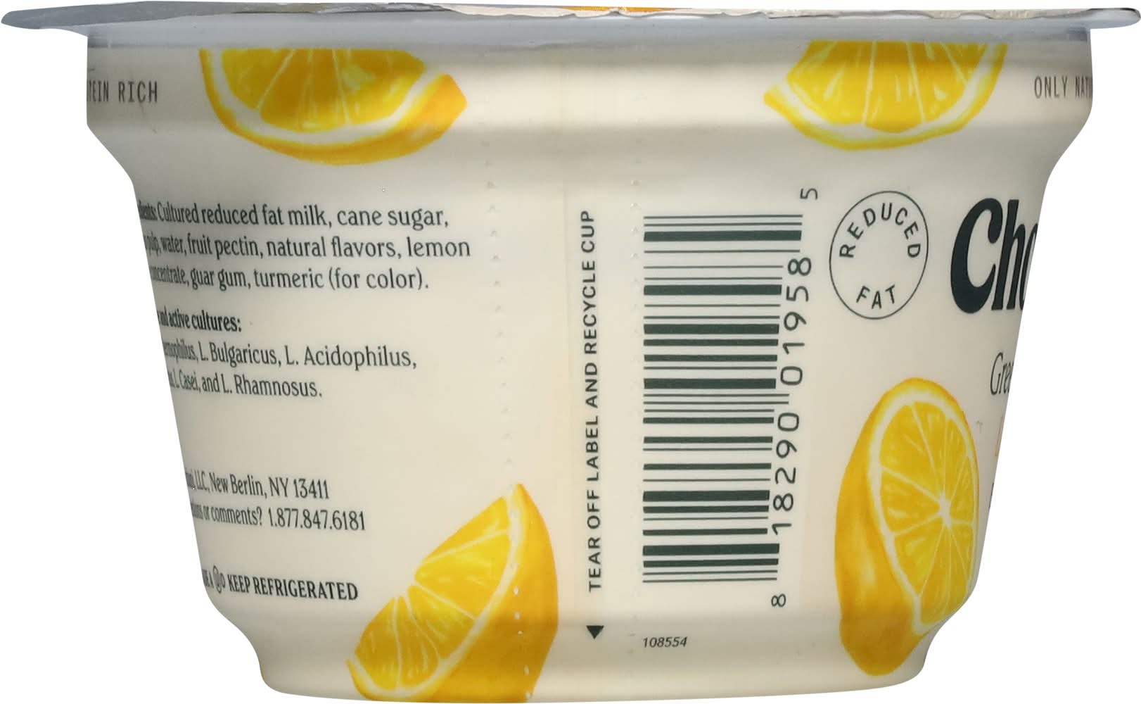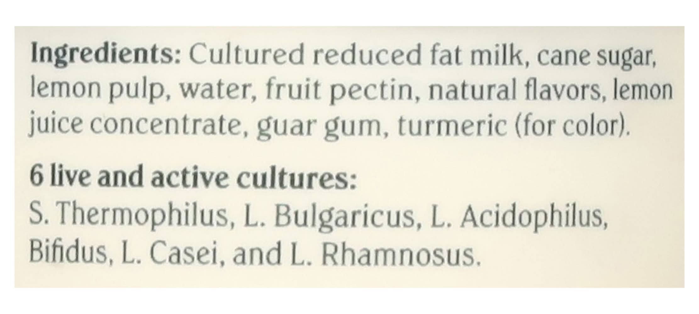 Ingredients: Cultured Reduced Fat Milk, Cane Sugar, Lemon Pulp, Water, Fruit Pectin, Natural Flavors, Lemon Juice Concentrate, Guar Gum, Turmeric (for Color), 6 Live and Active Cultures: S. Thermophilus, L. Bulgaricus, L. Acidophilus, Bifidus, L. Casei, and L, Rhamnosus Contains: Milk