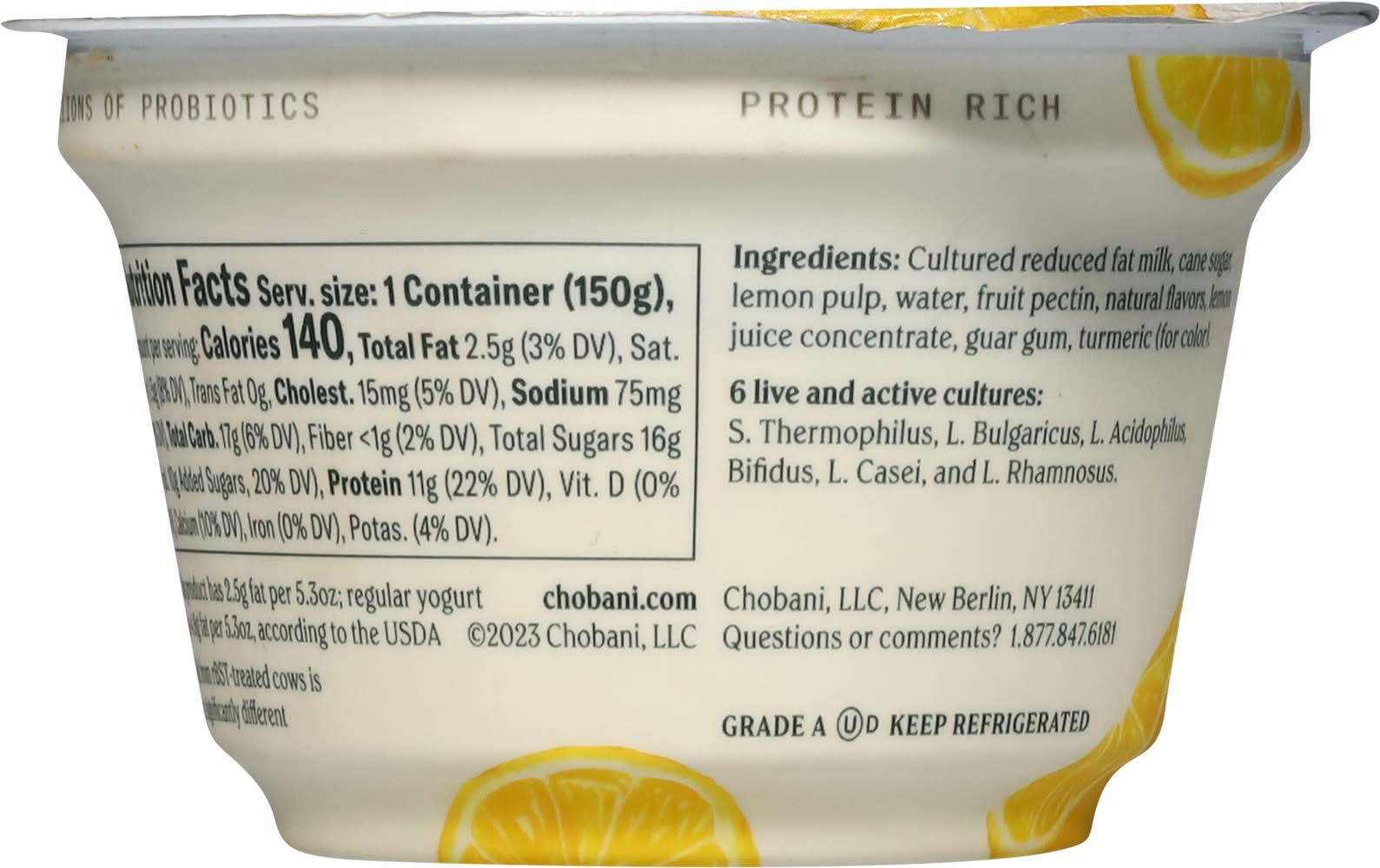 "Chobani® Greek Yogurt is crafted from farm-fresh local milk, making it an excellent source of protein. Nonfat, lowfat, and whole milk options are the perfect base for breakfast bowls, smoothies, and more.Bright, sweet lemon folded into delicious Chobani® Greek Yogurt. Crafted with only natural ingredients."Bright, sweet lemon folded into delicious Chobani® Greek Yogurt. Crafted with only natural ingredients." Flavor: Lemon