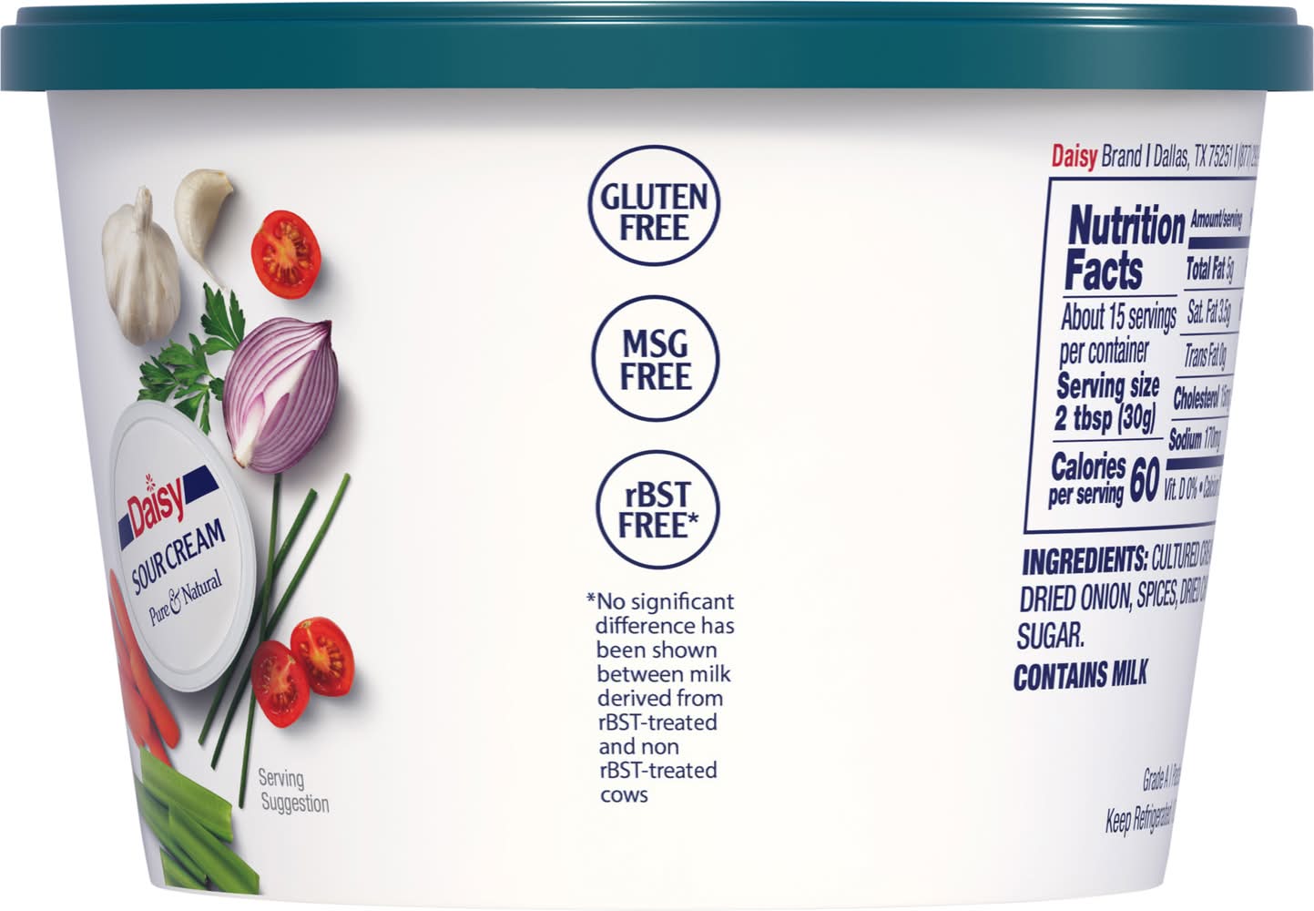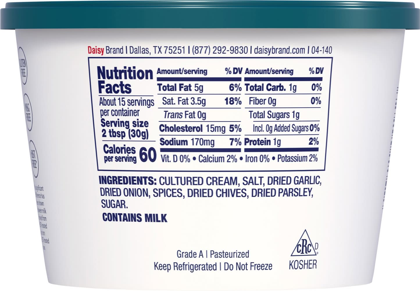 Ingredients: Cultured Cream, Salt, Dried Garlic, Dried Onion, Spices, Dried Chives, Dried Parsley, Sugar Contains: Milk