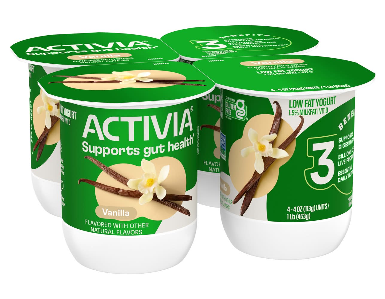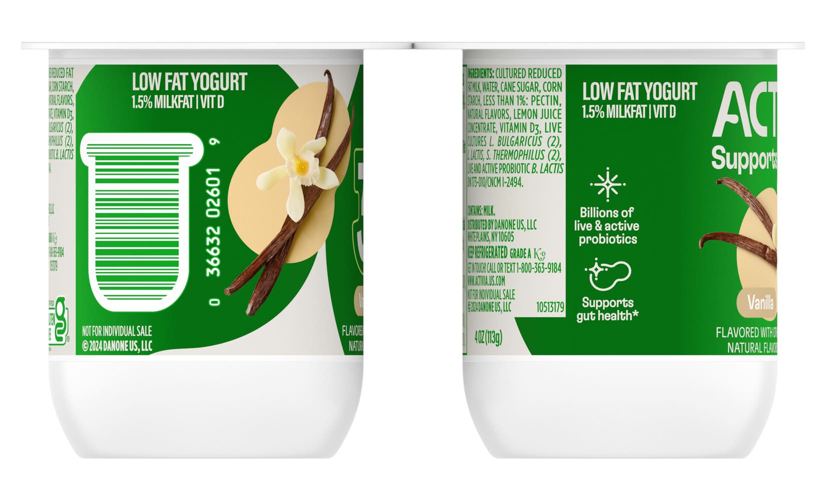 Start every day with Yogurt Cups, as part of your routine, from the 1 doctor-recommended probiotic brand. Every spoonful is full of delicious flavor and creamy texture. Plus, each serving is packed with our proprietary blend of live and active cultures and our exclusive probiotic. Probiotics are the living microorganisms that have been studied and shown to provide specific health benefits, including supporting gut health. yogurt contains Bifidobacterium lactis, which has been studied and shown to survive passage through the gastrointestinal tract. Making yogurt a part of your day is an easy way to help support your gut health. Grab an yogurt for an easy and delicious breakfast or enjoy one in the afternoon as an on the go snack. Your gut is where it all begins. Start with an Yogurt. Enjoying twice a day for two weeks as part of a balanced diet and healthy lifestyle may help reduce the frequency of minor digestive discomfort, which includes bloating, gas, abdominal discomfort & rumbling. Contains 10% DV of calcium & vitamin D per serving. • Flavor: Vanilla • Pack size: 4 • The Dannon Company, Inc., White Plains, Ny, 10605.