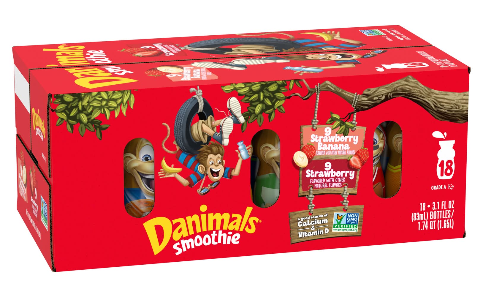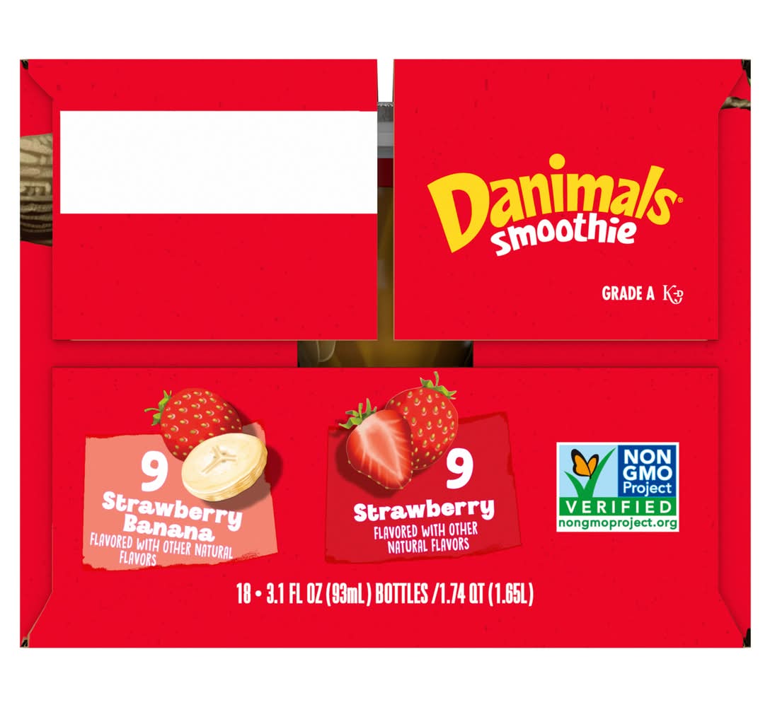 Adventure awaits with a Danimals Strawberry Explosion and Swingin' Strawberry Banana Smoothie Bottles Multi-Pack. These creamy dairy drink snacks for kids deliver a fruity blast of strawberry or strawberry banana flavor. With no artificial flavors, high fructose corn syrup or artificial colors, Danimals smoothies are kids snacks with a yummy taste. Pinky promise. So pop in a straw. Or just take a sip. Its adventure all bottled up in kid-inspired flavorsand a smooth way to give em vitamin D and calcium. Recess, lunch, snacktimeits no secret that the best part of their day includes a bottle. Thats why Danimals is the #1 kids brand in the yogurt aisle.* With Danimals, youre ready for adventure anytime, anywhere. *Source: IRI Unify (52 Weeks as of 12/31/21). • Flavor: Strawberry-banana • Pack size: 18