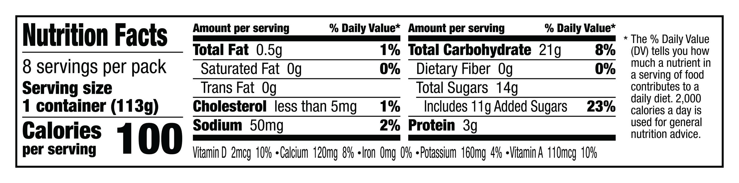 Ingredients: Strawberry : Cultured Grade A Low Fat Milk, Sugar, Modified Corn Starch. Contains 1% or Less of: Corn Starch, Natural Flavor, Potassium Sorbate Added to Maintain Freshness, Red 40, Blue 1, Yellow 5, Vitamin A Acetate, Vitamin D3. Berry : Cultured Grade A Low Fat Milk, Sugar, Modified Corn Starch. Contains 1% or Less of: Corn Starch, Natural Flavor, Potassium Sorbate Added to Maintain Freshness, Blue 1, Red 40, Vitamin A Acetate, Vitamin D3. Contains: Milk