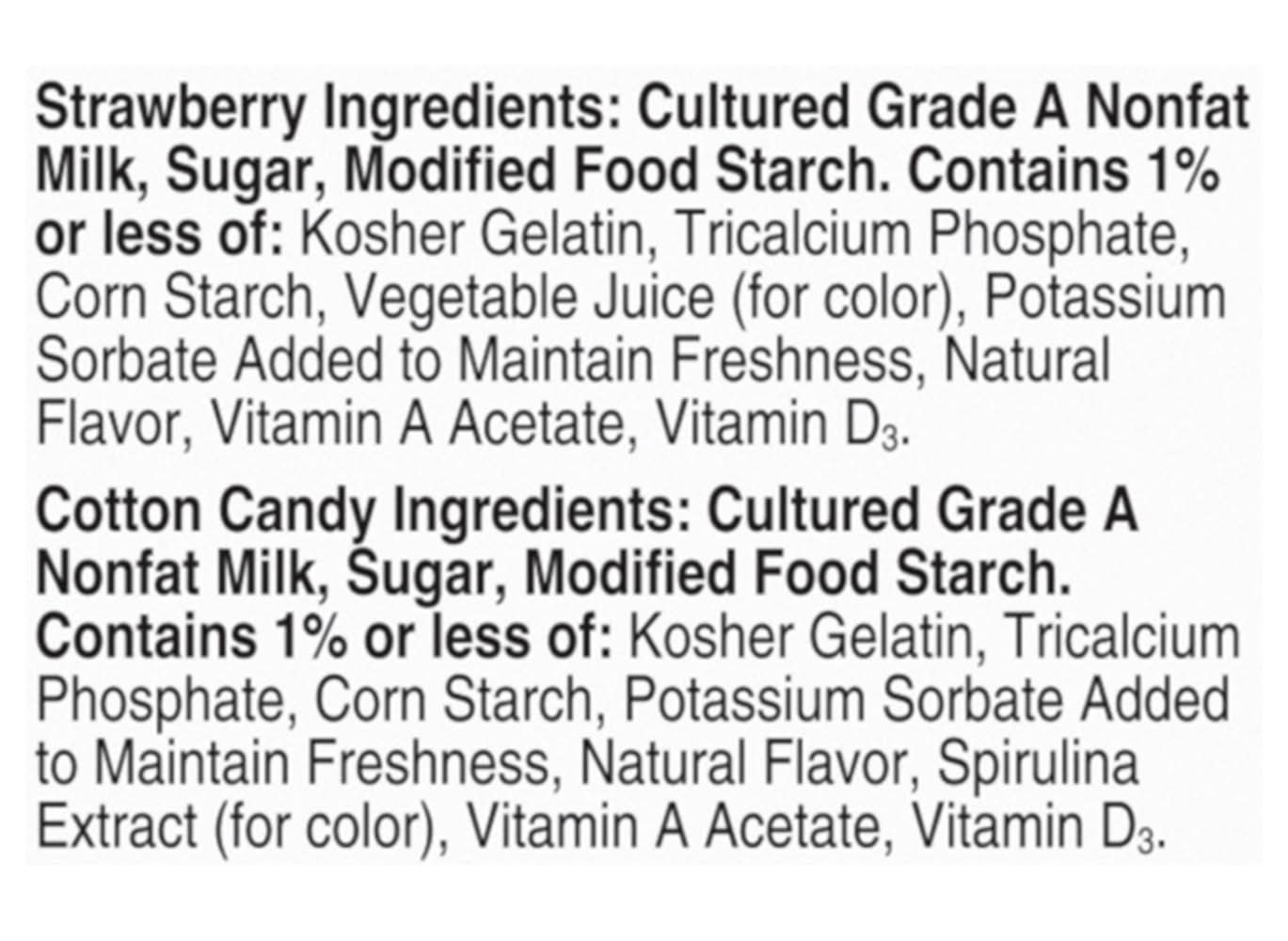 Ingredients: Strawberry Splash: Cultured Grade A Nonfat Milk, Sugar, Modified Food Starch, Contains 1% or Less of: Kosher Gelatin, Tricalcium Phosphate, Corn Starch, Vegetable Juice (for Color), Potassium Sorbate Added to Maintain Freshness, Natural Flavor, Vitamin A Acetate, Vitamin D3. Cool Cotton Candy: Cultured Grade A Nonfat Milk, Sugar, Modified Food Starch, Contains 1% or Less of: Kosher Gelatin, Tricalcium Phosphate, Corn Starch, Potassium Sorabte Added to Maintain Freshness, Natural Flavor, Spirulina Extract (for Color), Vitamin A Acetate, Vitamin D3. Contains: 'Milk Contains', 'Corn Contains', 'Milk Contains', 'Corn Contains'