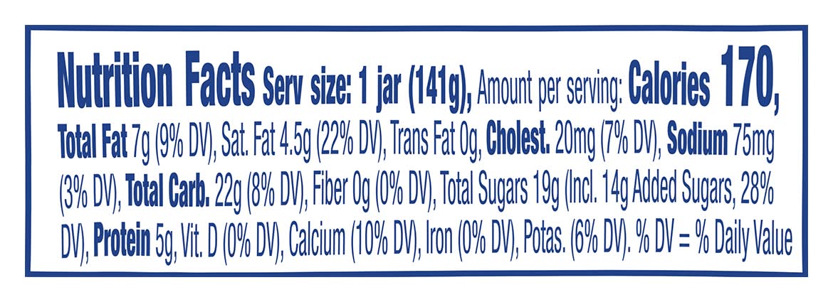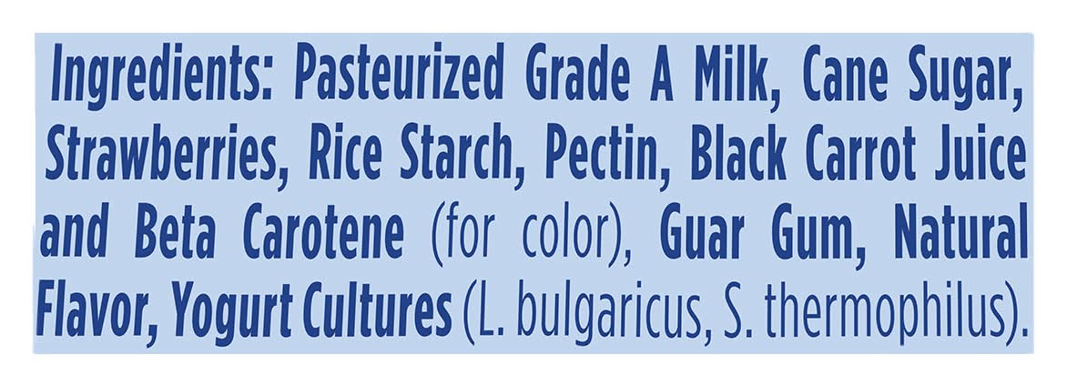 Ingredients: Pasteurized Grade A Milk, Cane Sugar, Strawberries, Rice Starch, Pectin, Black Carrot Juice and Beta Carotene (for Color), Guar Gum, Natural Flavor, Yogurt Cultures (L. Bulgaricus, S. Thermophilus) Contains: Milk