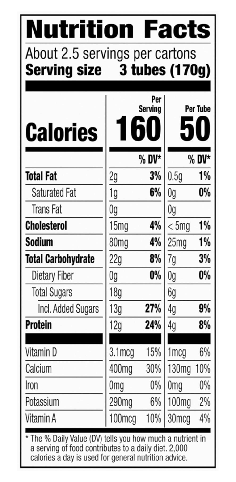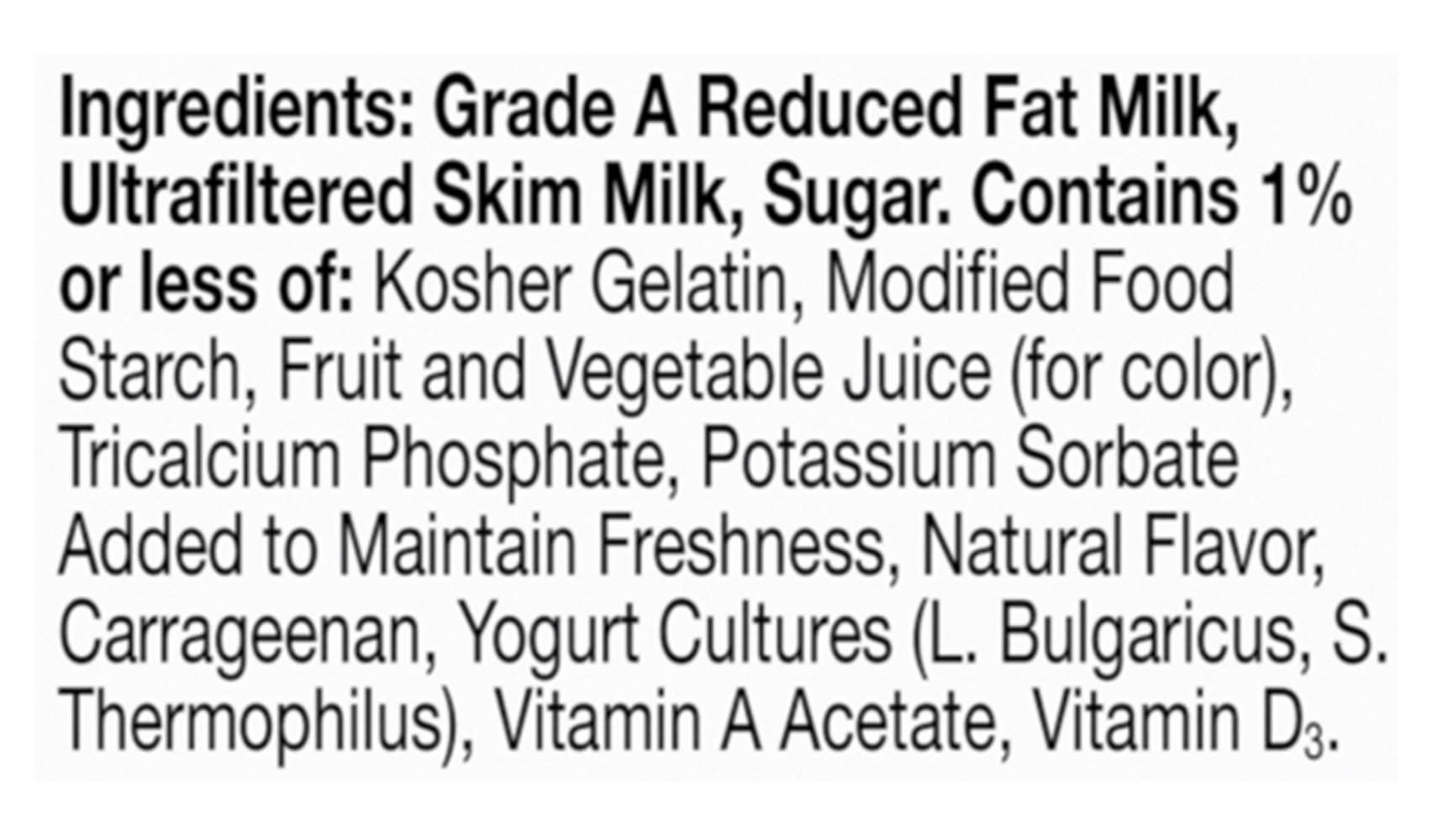 Ingredients: Grade A Reduced Fat Milk, Ultrafiltered Skim Milk, Sugar, Contains 1% or Less of: Kosher Gelatin, Modified Food Starch, Fruit and Vegetable Juice (for Color), Tricalcium Phosphate, Potassium Sorbate Added to Maintain Freshness, Natural Flavor, Carrageenan, Yogurt Cultures (L. Bulgaricus, S. Thermophilus), Vitamin A Acetate, Vitamin D3 Contains: Milk