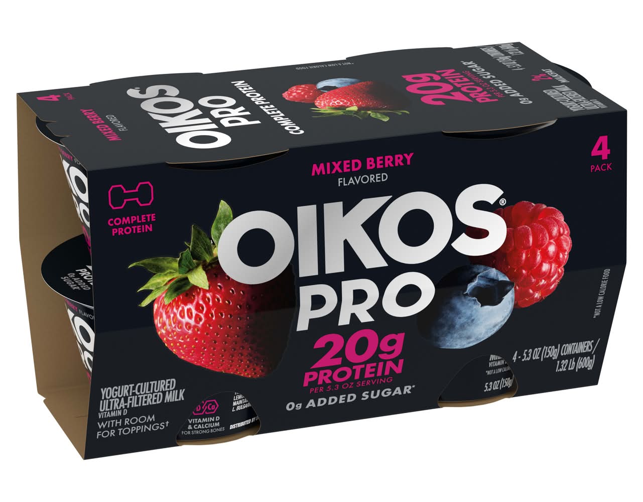 Go Pro with Oikos Pro Mixed Berry Yogurt-Cultured Ultra-Filtered Milk Product. The spoon-able high protein snack with more of what you want, and less of what you don’t. Each Oikos Pro snack cup packs a punch with 20g of protein. Plus, every serving contains nine essential amino acids, in addition to vitamin D and calcium for strong bones. There’s 0g of added sugar per serving, and no artificial flavors or colors from artificial sources. Our ultra-filtered dairy product is so thick and creamy, you can always have dependable, high protein snacks. Because when you feel strong, you are unstoppable. With protein and deliciousness, these snacks for adults can help you strive to reach your potential with every serving. Protein is important - an essential nutrient that we need in our diet - and Oikos Pro cups are great tasting, convenient solutions for adding complete protein every day. Pack a Mixed Berry snack cup for days that start at a sprint, and enjoy a delicious boost of protein at lunch. Each snack cup leaves room for toppings, so throw in your favorite fruit for an extra refreshing snack. Need 0g sugar, 0 artificial sweeteners, and 0 fat? Try Oikos Triple Zero with 15g of protein per serving. Want the creamy one with the fruit chunks? Oikos Blended has you covered. Oikos Pro — stronger makes everything better. Not a low-calorie food. • Flavor: Mixed berry • Pack size: 4