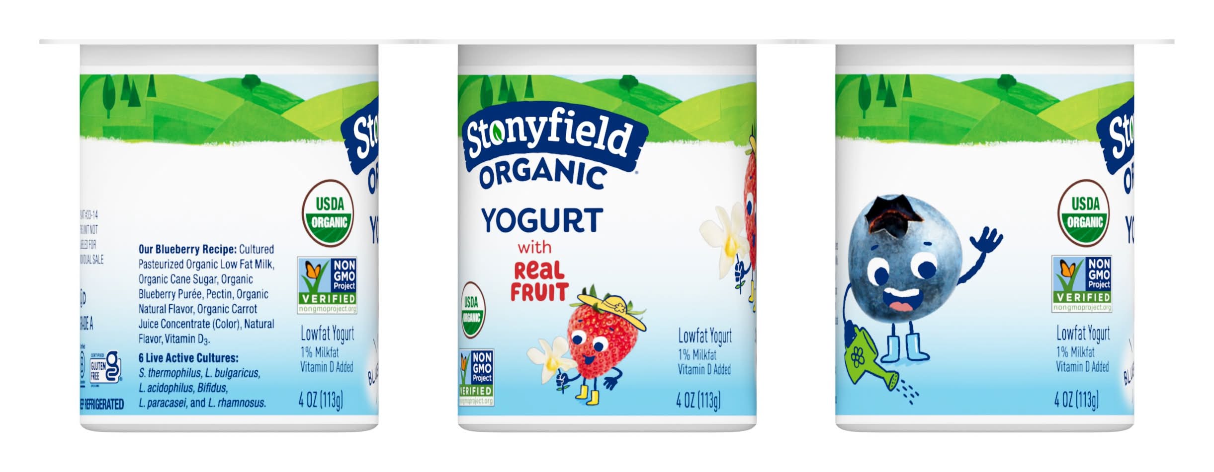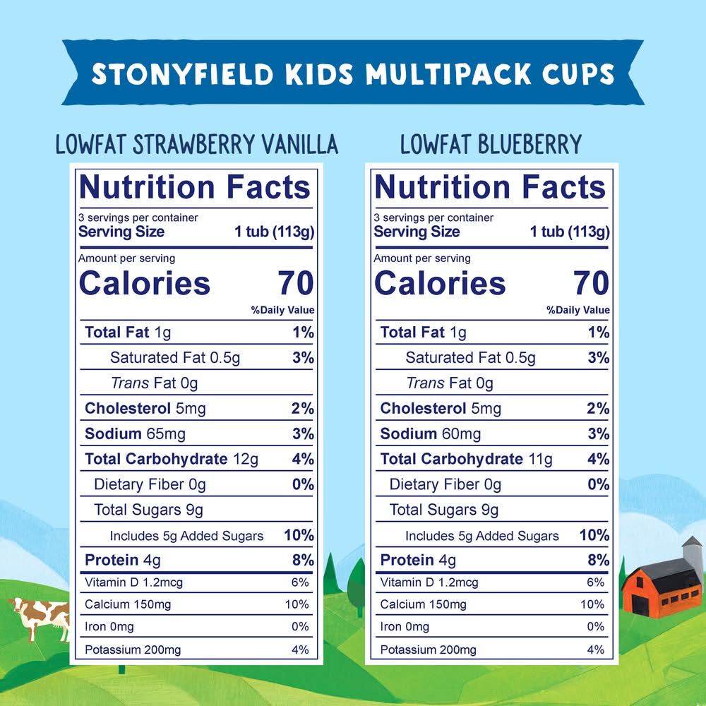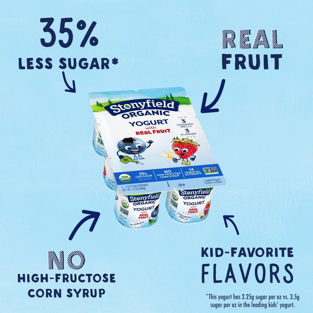 Usda Organic. Certified Organic By Qai. Lowfat. 1% Milkfat Vitamin D Added. 35% Less Sugar Than The Leading Kids Yogurt. • Flavor: Strawberry vanilla-blueberry • Pack size: 6 • Stonyfield Farm, Inc., Londonderry, NH, 03053