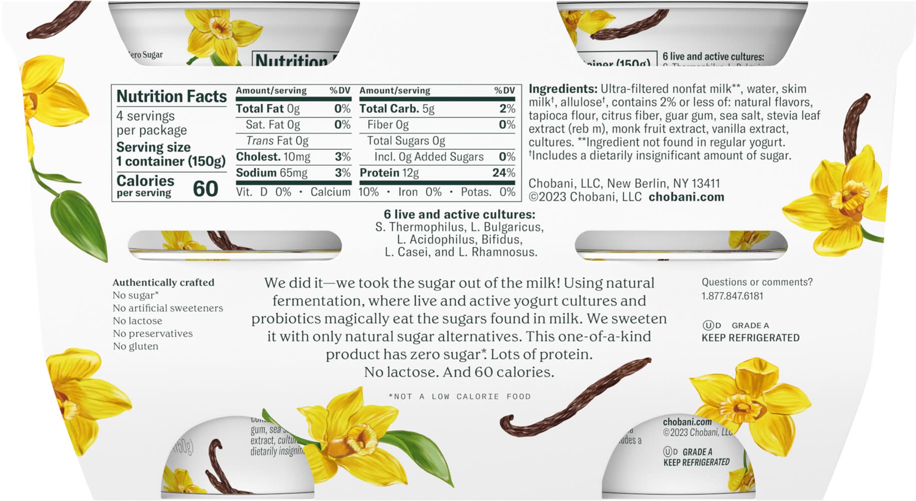 We took the sugar out of the milk! Using natural fermentation, where live and active cultures and probiotics magically eat the sugars found . We sweeten it with only natural sugar alternatives. • Flavor: Vanilla • Pack size: 4 • Chobani LLC, New Berlin, NY, 13411 • Packaging: Reusable