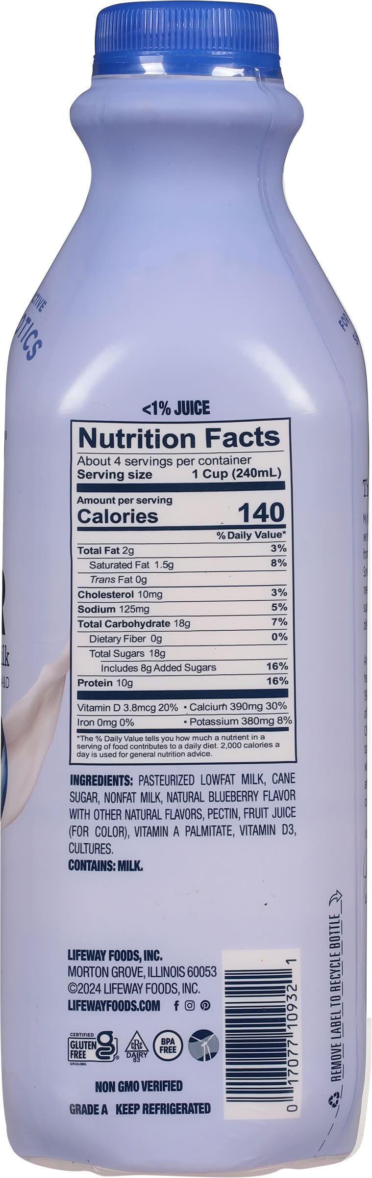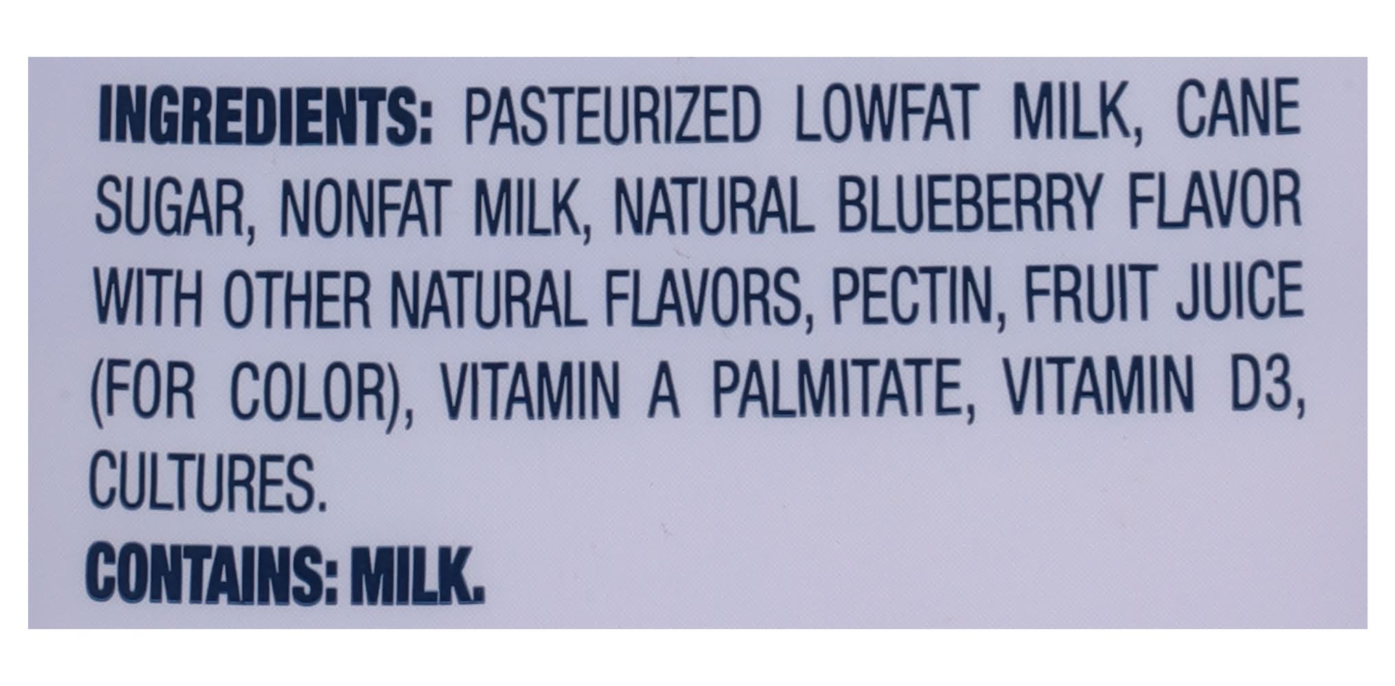 Ingredients: Pasteurized Lowfat Milk, Cane Sugar, Nonfat Milk, Natural Blueberry Flavor with Other Natural Flavors, Pectin, Fruit Juice (for Color), Vitamin A Palmitate, Vitamin D3, Cultures Contains: Milk