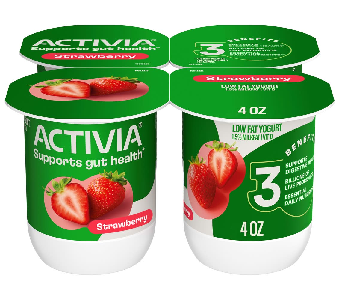 Start every day with Activia Probiotic Strawberry Lowfat Yogurt Cups, as part of your routine, from the #1 doctor-recommended probiotic brand. Every spoonful is full of delicious strawberry flavor and creamy texture. Plus, each serving is packed with our proprietary blend of live and active cultures and our exclusive probiotic. Probiotics are the living microorganisms that have been studied and shown to provide specific health benefits, including supporting gut health.* Activia yogurt contains Bifidobacterium lactis DN 173-010/CNCM I-2494, which has been studied and shown to survive passage through the gastrointestinal tract. Making Activia probiotic yogurt a part of your day is an easy way to help support your gut health. Grab an Activia strawberry yogurt for an easy and delicious breakfast, mix it into a yogurt smoothie or enjoy one in the afternoon as an on the go snack. Your gut is where it all begins. Start with an Activia Probiotic Lowfat Yogurt. Enjoying Activia twice a day for two weeks as part of a balanced diet and healthy lifestyle may help reduce the frequency of minor digestive discomfort, which includes bloating, gas, abdominal discomfort & rumbling. Contains 10% DV of calcium & vitamin D per serving. Based on a 2024 national weighted survey of 300 doctors. • Flavor: Strawberry • Pack size: 4 • The dannon company, inc., White Plains, NY, 10605
