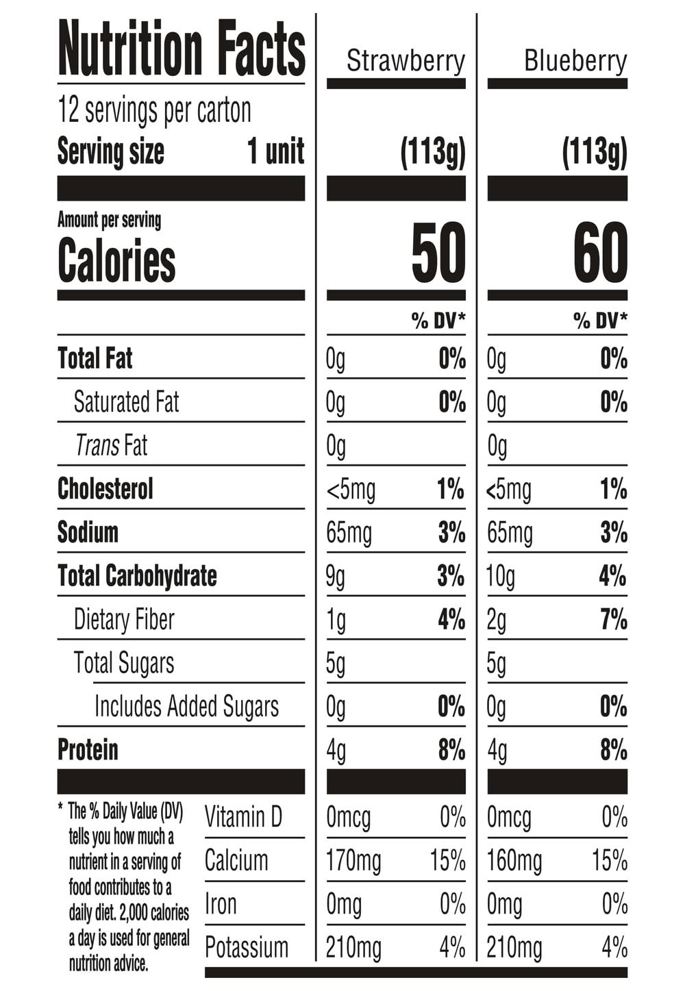 Ingredients: Strawberry: Cultured Non Fat Milk, Strawberries, Water, Modified Food Starch, Less than 1%: Natural Flavors, Carmine (for Color), Sucralose, Calcium Lactate, Xanthan Gum, Acesulfame Potassium, Malic Acid, Live Culture L. Bulgaricus (2) L, Lactis, S. Thermophilus, Live and Active Probiotic B, Lactis. Blueberry: Cultured Non Fat Milk, Blueberry Puree, Water, Modified Food Starch, Less than 1%: Inulin, Carmine (for Color), Natural Flavors, Pectin, Sucralose, Calcium Lactate, Acesulfame Potassium, Xanthan Gum, Malik Acid, Live Culture L. Bulgaricus (2), Lactis, S. Thermophilus, Live and Active Probiotic B, Lactis. DN 173-010/CNCM I-2494 Contains: Milk