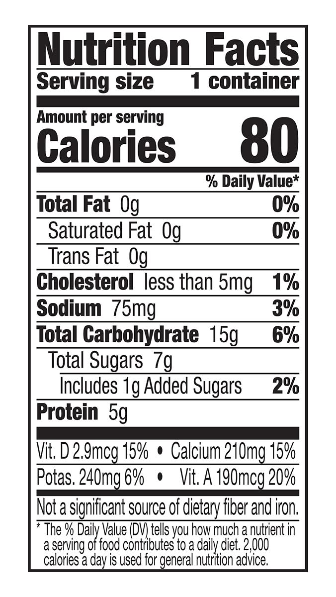 Ingredients: Cultured Grade A Nonfat Milk, Water, Blueberries, Modified Food Starch, Contains 1% or Less of: Allulose, Kosher Gelatin, Corn Starch, Tricalcium Phosphate, Citric Acid, Acesulfame Potassium, Sucralose, Potassium Sorbate Added to Maintain Freshness, Natural Flavor, Red #40, Vitamin A Acetate, Blue #1, Vitamin D3 Contains: Milk