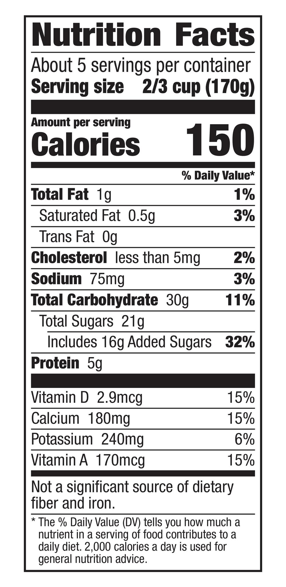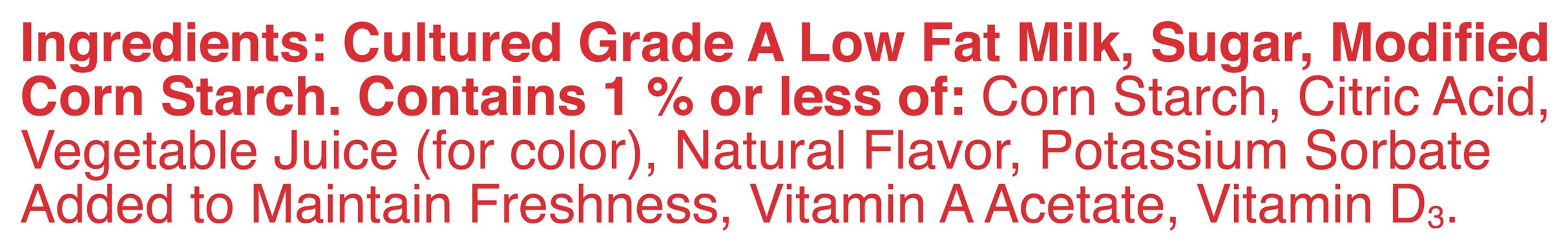 Ingredients: Cultured Grade A Low Fat Milk, Sugar, Modified Corn Starch, Contains 1 % or Less of: Corn Starch, Citric Acid, Vegetable Juice (for Color), Natural Flavor, Potassium Sorbate Added to Maintain Freshness, Vitamin A Acetate, Vitamin D3 Contains: Milk