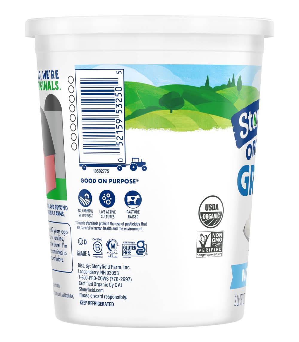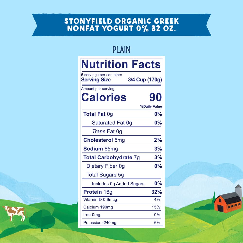 Stonyfield Organic is making it easier and more delicious to up your protein intake--after all, you need the energy for your busy on-the-go lifestyle. Our Plain Greek Nonfat Yogurt makes mornings brighter and healthier because it's packed with 16g of protein per serving! We use 100% organic milk from pasture-raised cows and with simple ingredients to create a tantalizing snack for adults and kids on the go. And don't forget: Our yogurt is a great substitute in your favorite recipes! Substitute with yogurt to cut fat and calories in dressings, desserts, baked goods, creamy soups and more. Stonyfield Greek yogurt is made without the use of toxic persistent pesticides, antibiotics, artificial growth hormones, or genetically modified organisms (GMOs), protecting you for the long haul and contributing to a healthy and sustainable world. With high-quality ingredients and no added nonsense, Stonyfield Organic Yogurt is #goodonpurpose! • Number of servings: 5 • Stonyfield farm, Inc., Londonderry, NH, 03053