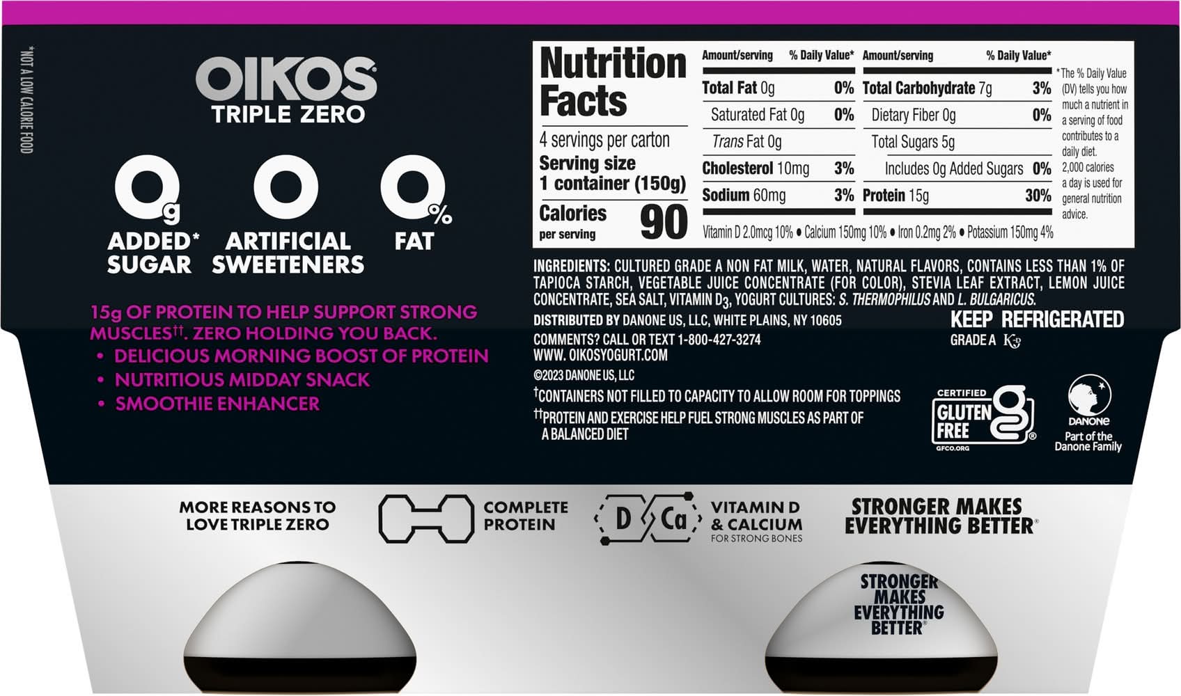 You can always have dependable, high protein snacks with zero holding you back. Because when you feel strong, you are unstoppable. with protein and deliciousness, this greek sugar free nonfat yogurt can help you strive to reach your potential with every serving. • Flavor: Mixed berry • Pack size: 4 • Danone US, LLC, White Plains,NY,10605 • Packaging: Reusable