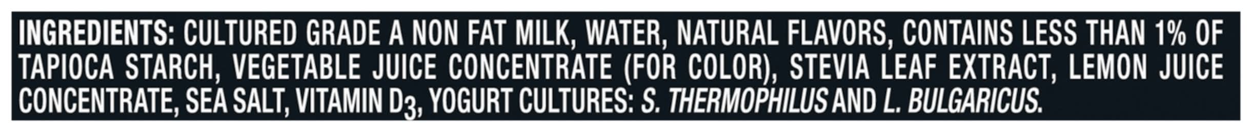 Ingredients: Cultured Grade A Non Fat Milk, Water, Chicory Root Fiber, Contains Less than 1% of Stevia Leaf Extract, Natural Flavors, Vegetable Juice Concentrate (for Color), Lemon Juice Concentrate, Sea Salt, Vitamin D3. Contains Active Yogurt Cultures: S. Thermophilus & L. Bulgaricus. Contains: Contains milk.