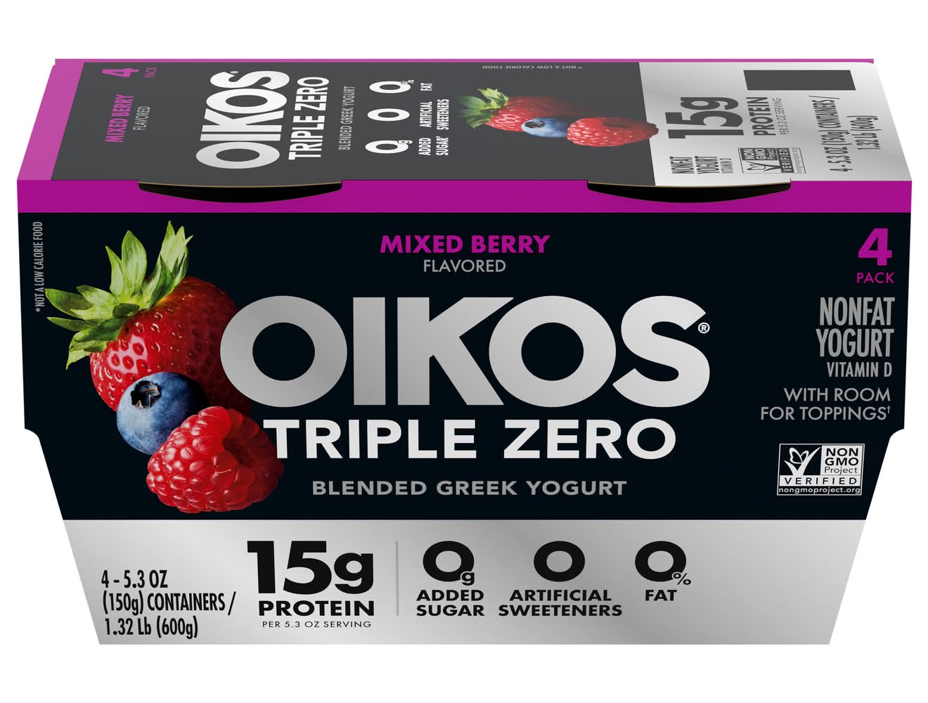 Oikos Triple Zero Blended Greek Yogurt, Mixed Berry (4 x 5.3 oz)
